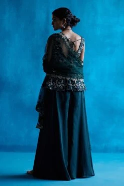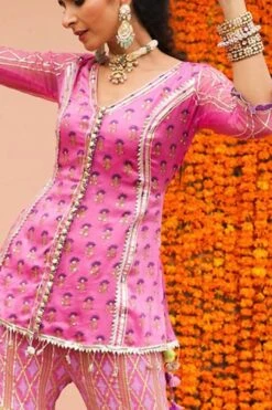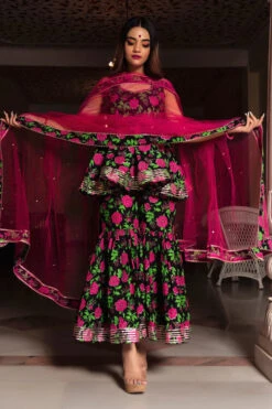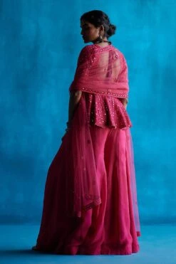 Hot Pink Mirror Flared Sharara With Green Chantily Multicolor Mirrorwork Blouse & Dupatta