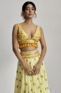 Silver Skirt In Crushed Metallic Lycra With Side Trails, Plunge Neck Crop Top And Choker Dupatta