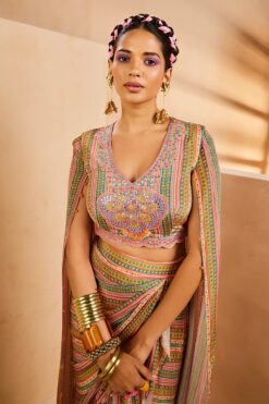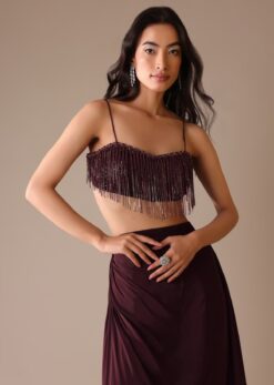 Silver Draped Skirt And Ruched Crop Top In Metallic Lycra Fabric With Pleat Detail And Full Sleeves