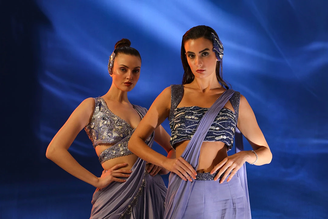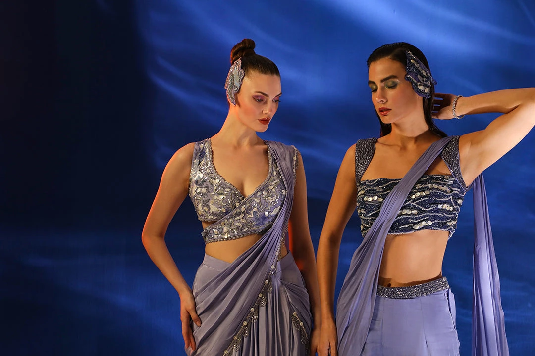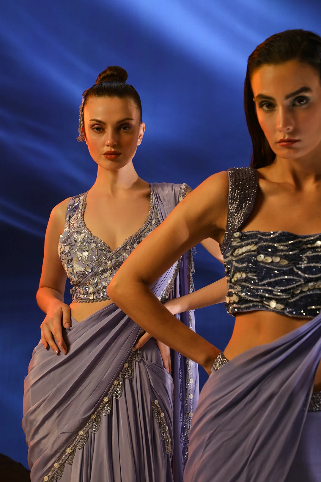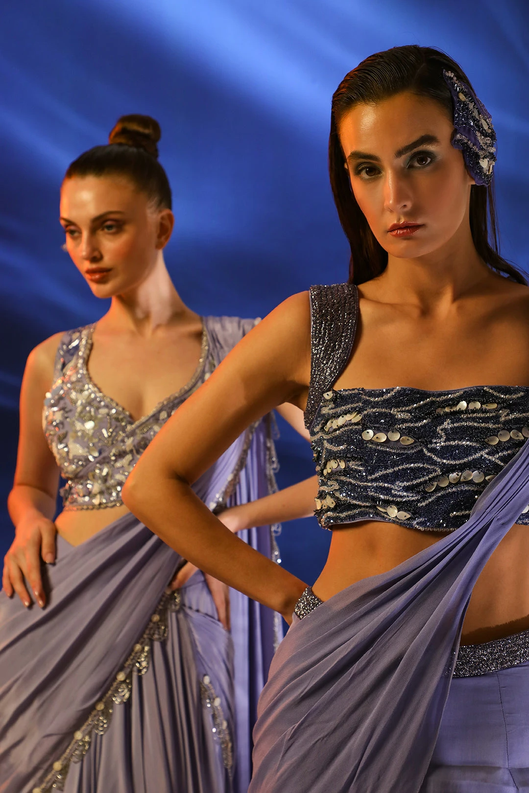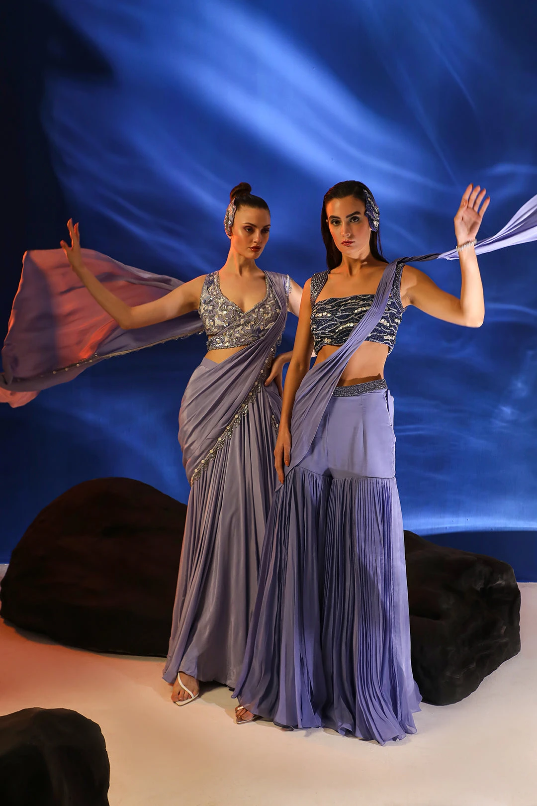 Iris purple knife pleated gharara saree with attached drape. Paired with straight neck bustier in crystal, sequin embroidery.