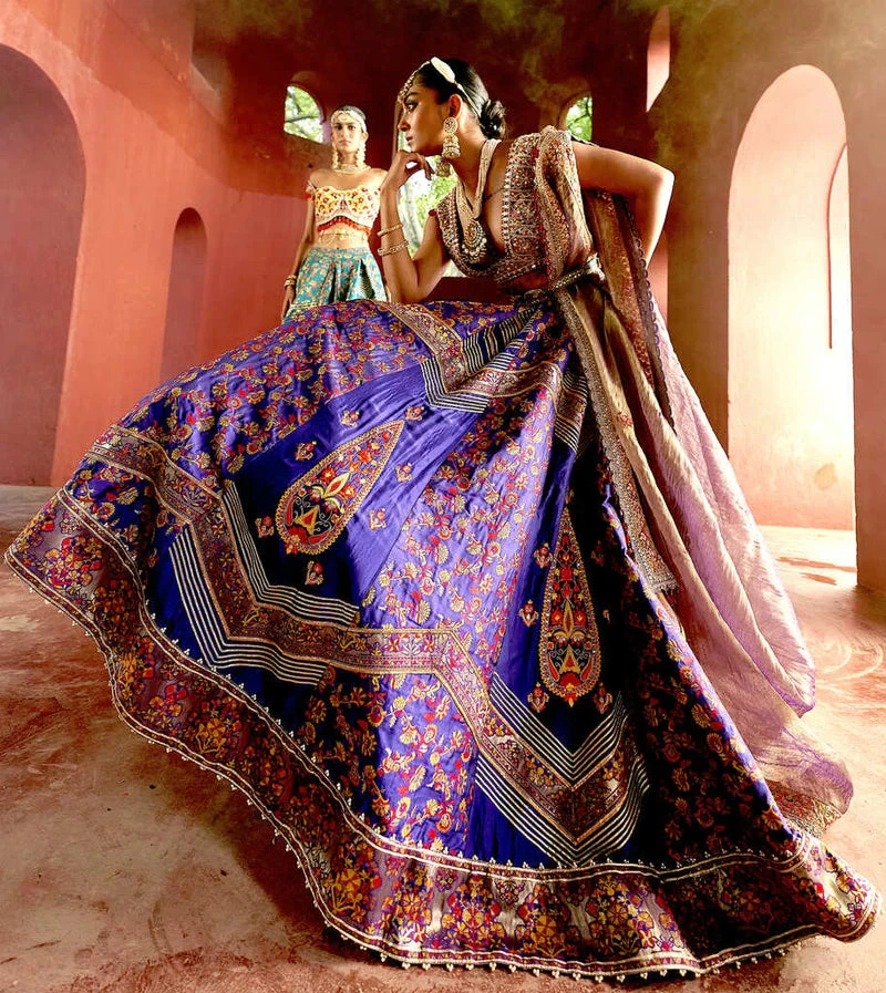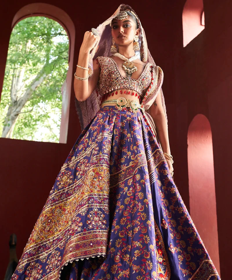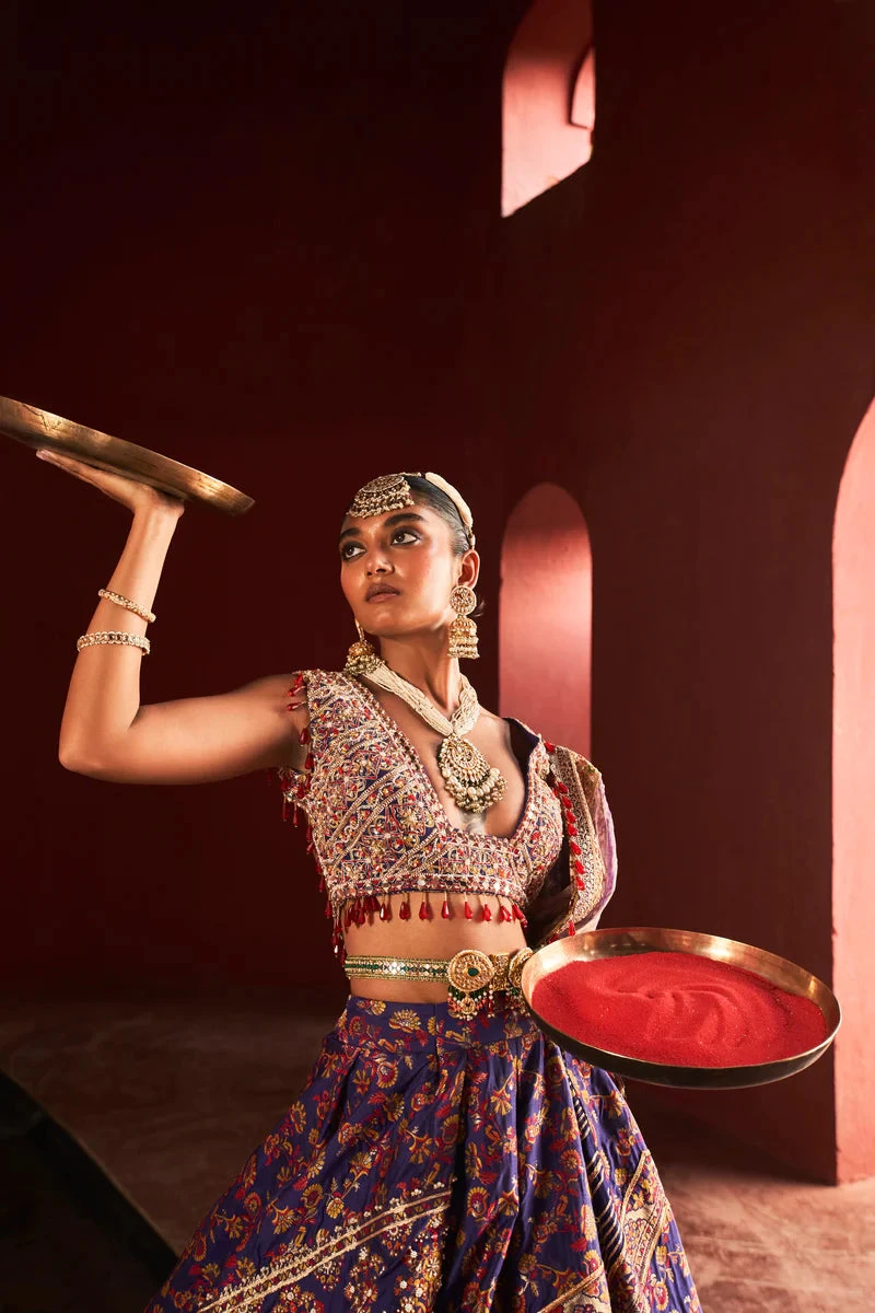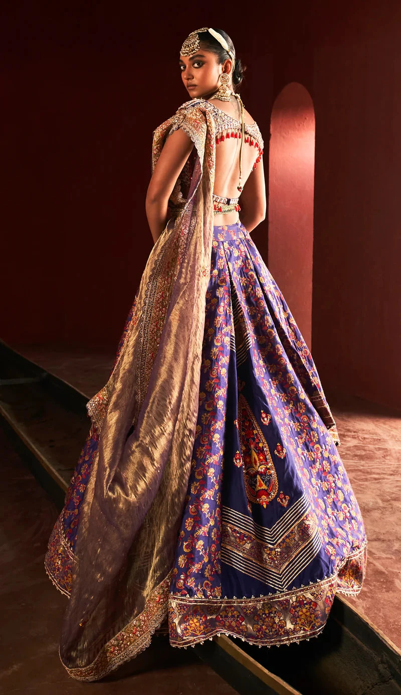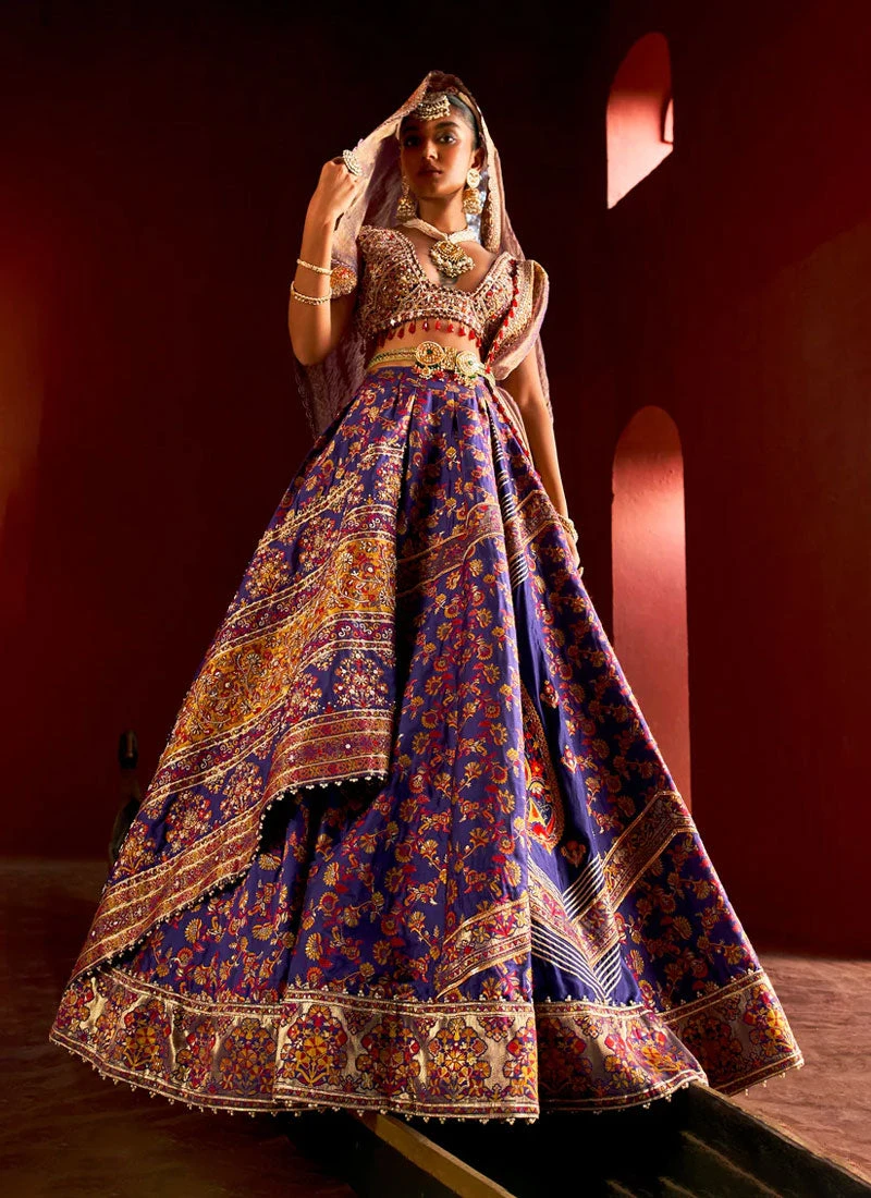 Purple Kani Silk lehenga set featuring deep square neck blouse, sleeveless blouse and shimmer dupatta. The blouse includes of heavy hand embroidery all over to give a soft touch with a mix of modern and tradition look, while the blouse has embroider applique all over with little colorful beads all over the border giving it a luxury look. This set comes with a well crafted handmade belt which is worn over to define the waistline.