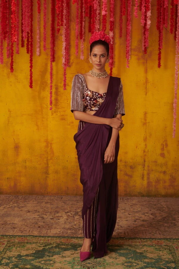 Purple pre-draped saree attached with embroidered pant. Paired with floral embroidered blouse.