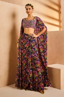 Featuring a wrap skirt and a ruffled cape set richly printed in foliage botanical patterns. The bustier is intricate embroidered with organza appliquŽs , thread and mirror embroidary.