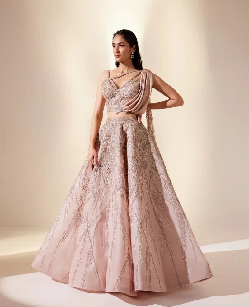 The flowing lehenga , paired with a matching embellished blouse and attached duppatta featuring delicate work