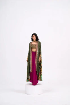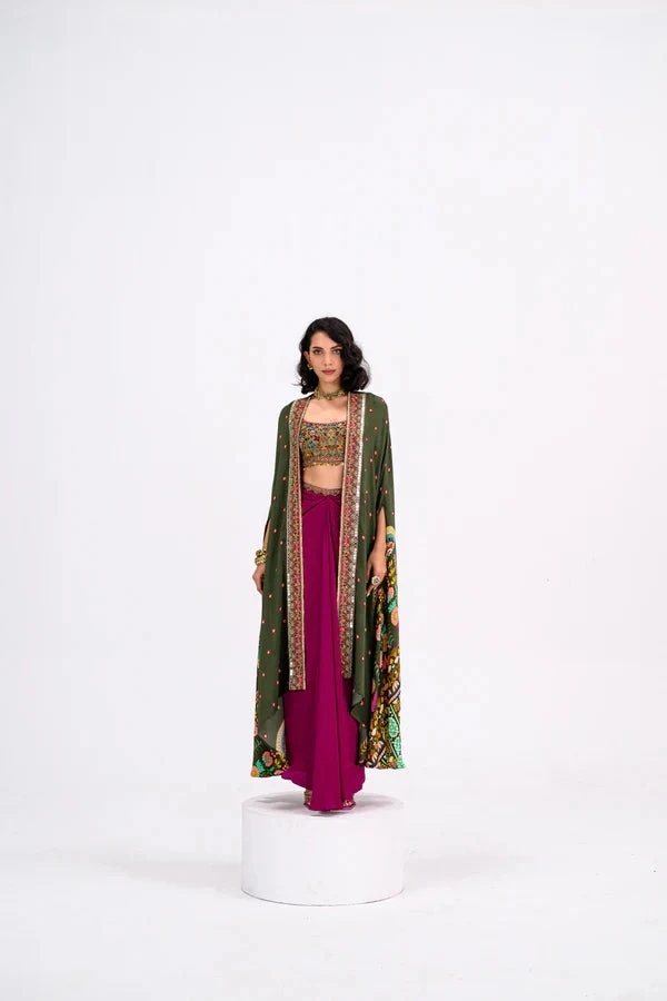 Elevate your festive wardrobe with our Rani Dhoti set paired embroidered bralette and cape, a perfect fusion of traditional and contemporary styles.