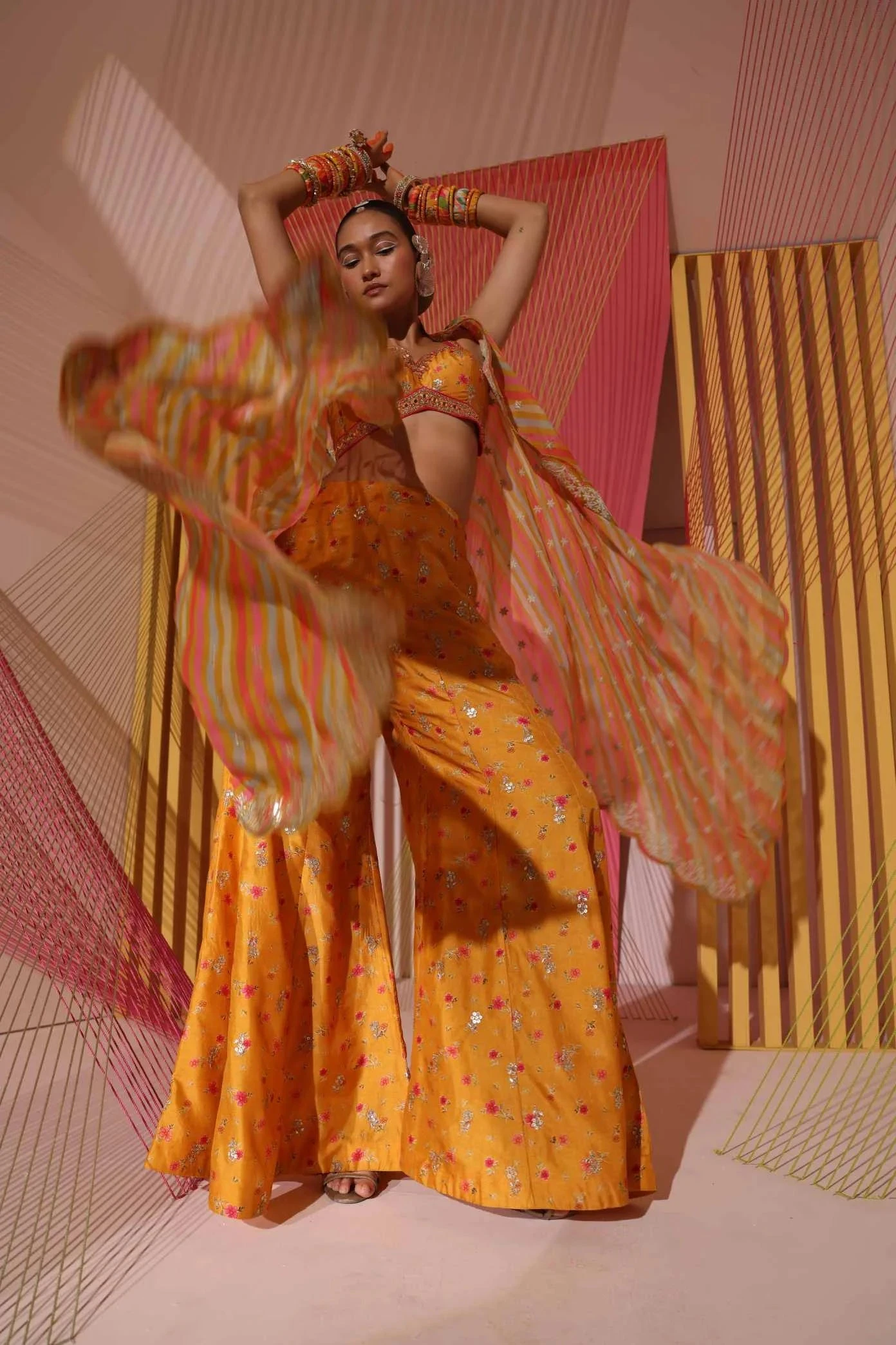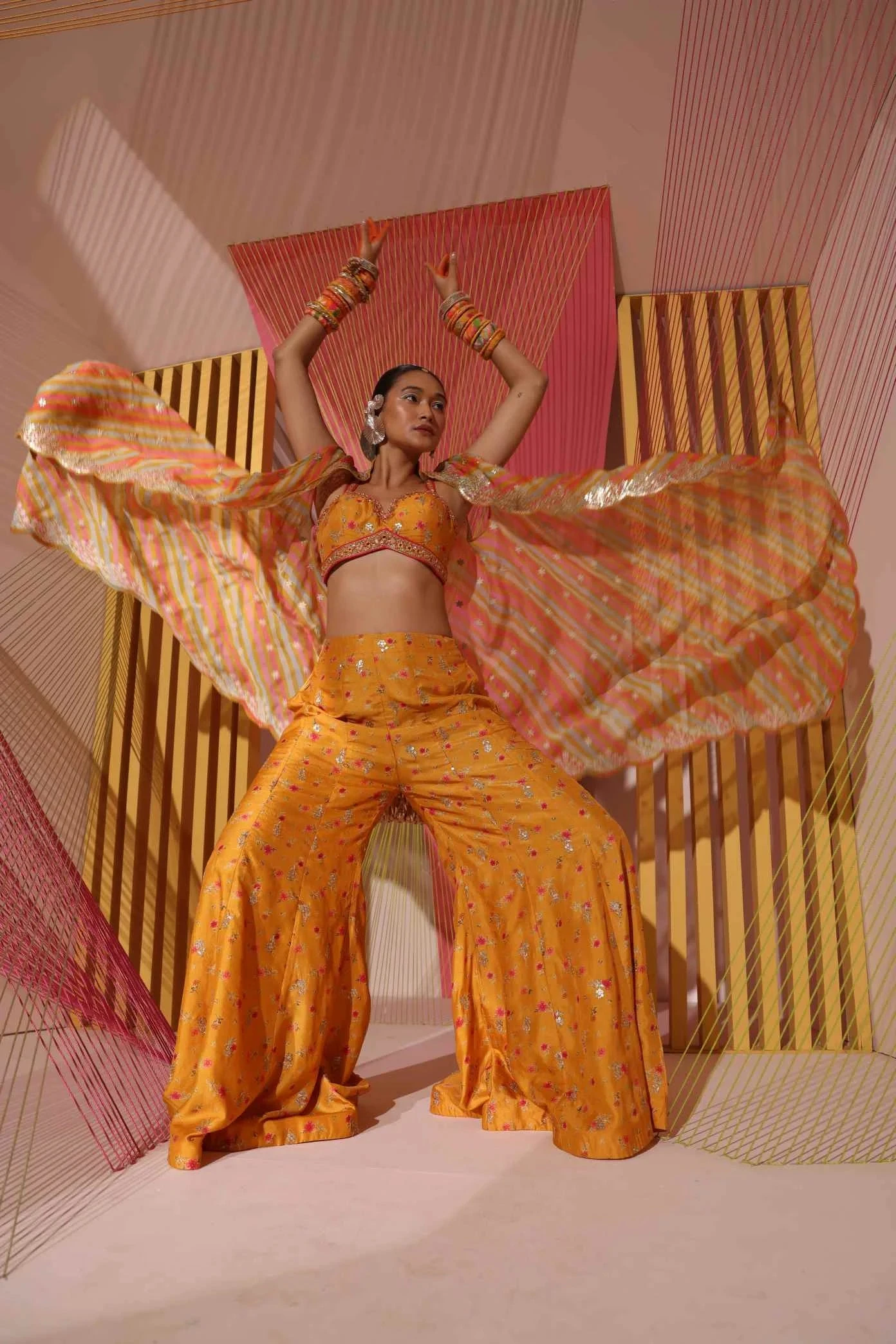 Fabric Composition: Bustier – Tussar Silk, Pant – Tussar Silk, Cape – Leheriya Organza