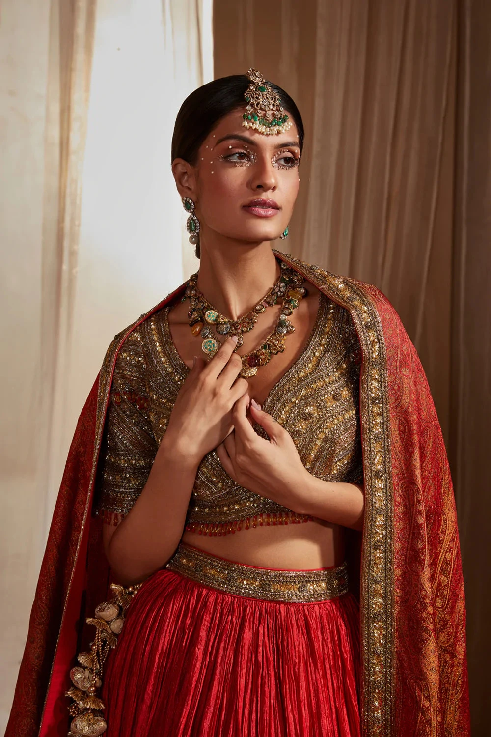 Red crinkled fabric lehenga with an heavy embroidered blouse and dupatta.