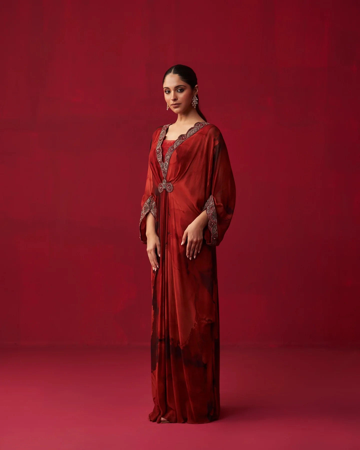 Red georgette marble print Kaftan accentuated with embroidery on the neckline and waist belt, having tassel details