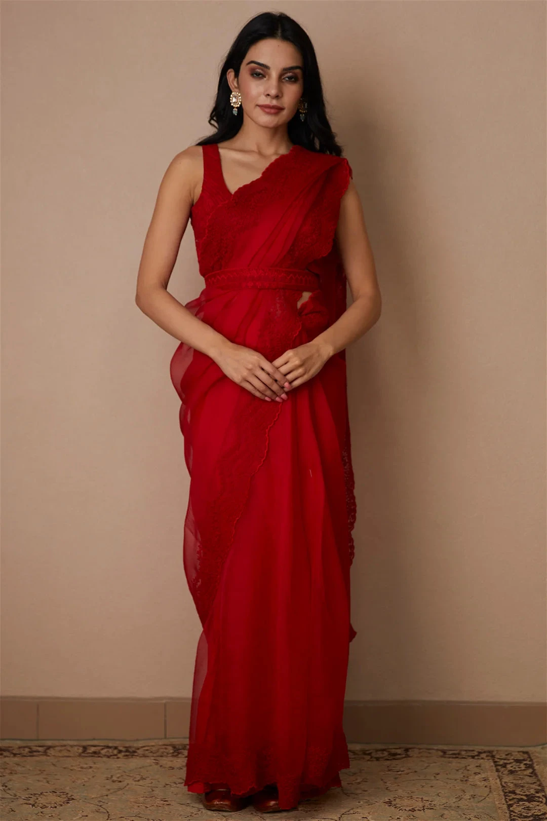 - Red Organza Scallop Border Thread Work Saree Set With Petticoat And Belt