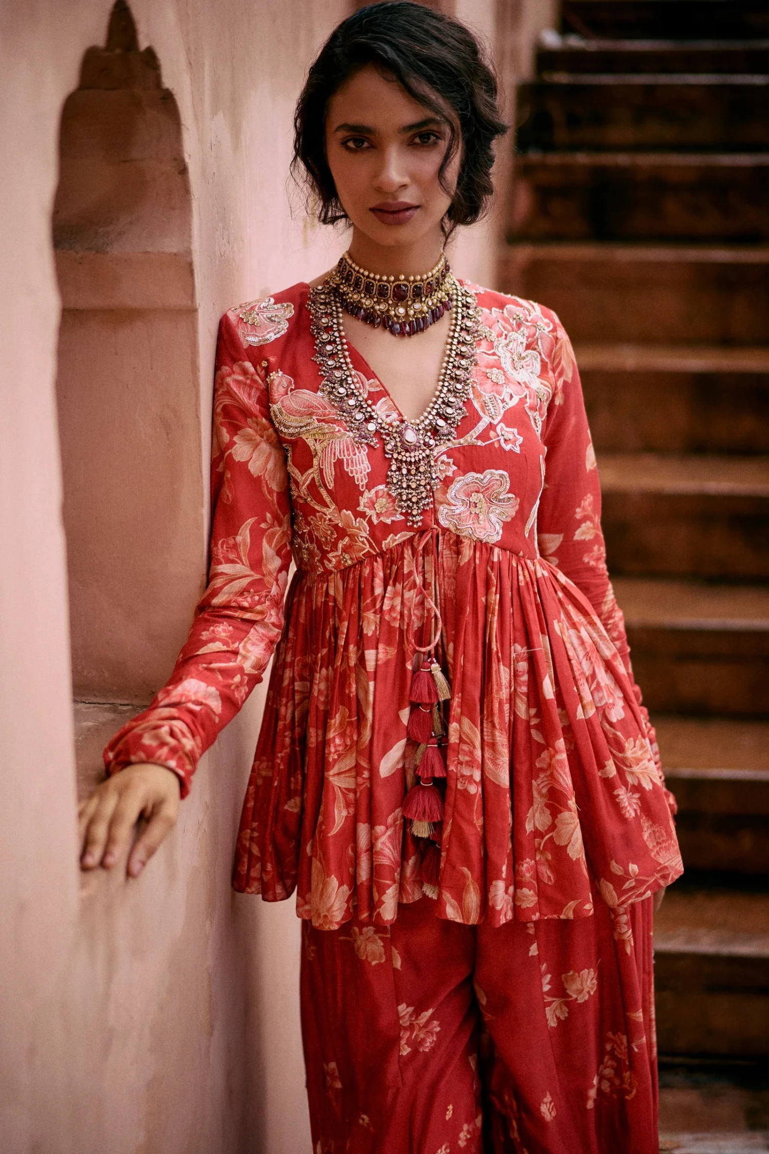 – Components: 2 [Peplum, Palazzos]– Colour: Crimson Red