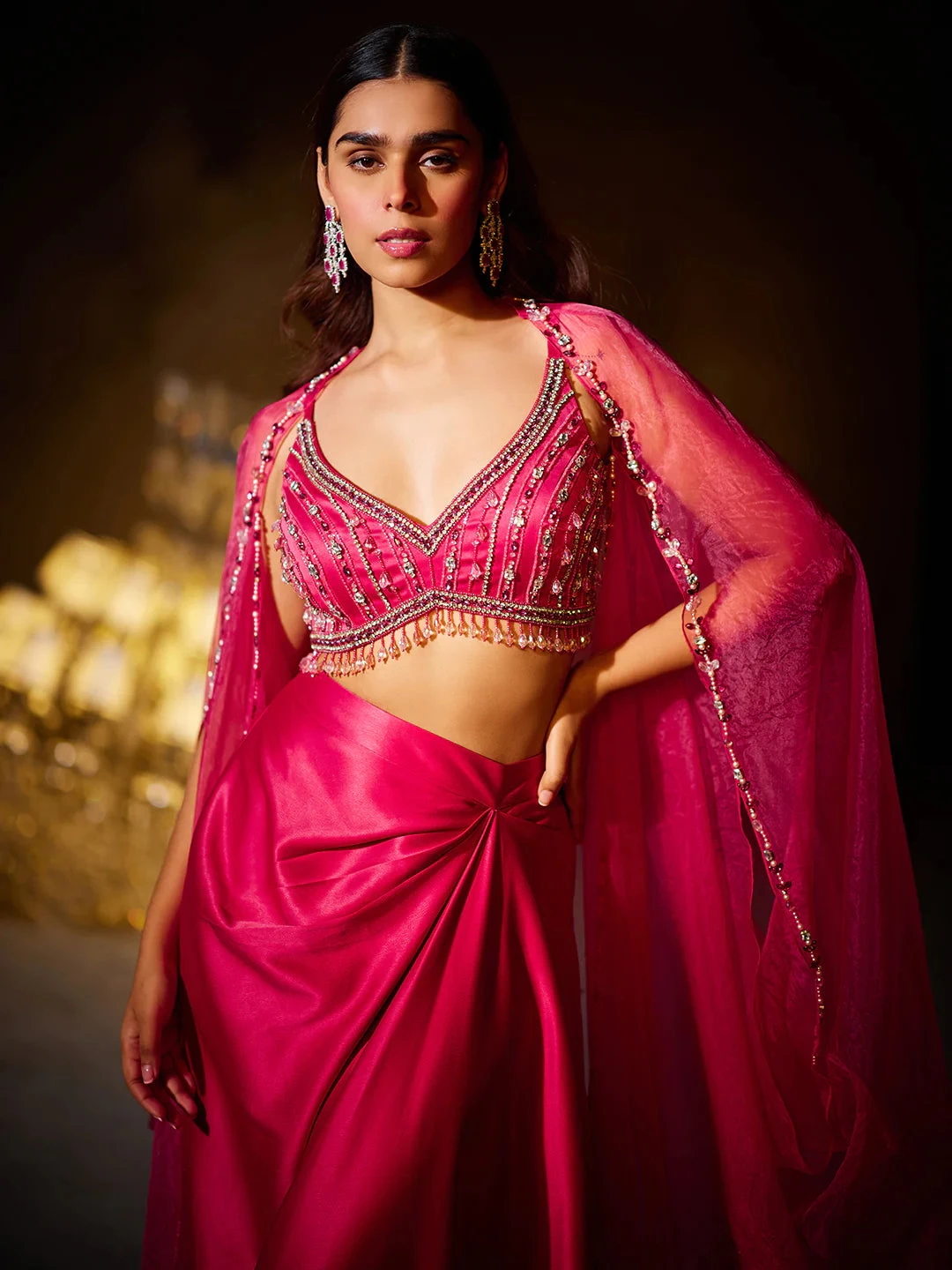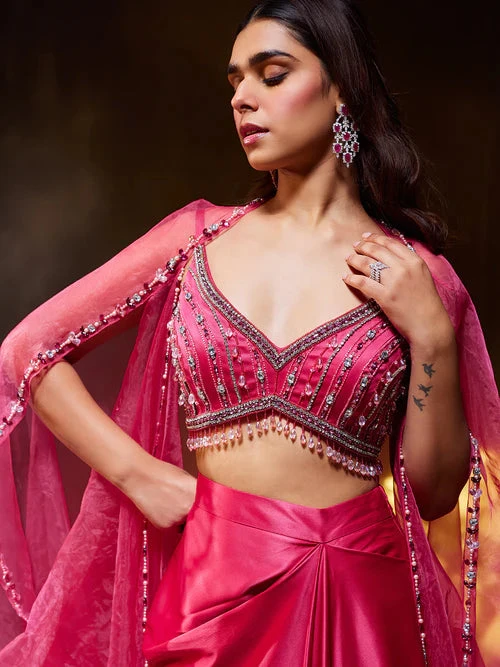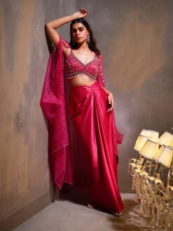 Our ROSE Cape Set presents a blend of feminine grace with its flowing skirt and hand-embellished blouse. The billowing cape adds an opulent touch to the ensemble, adorned with delicate embellishments.