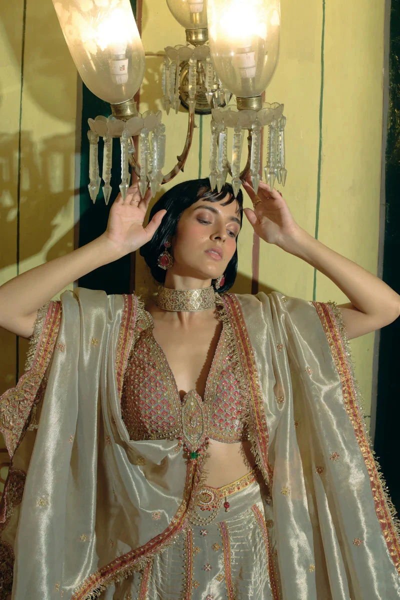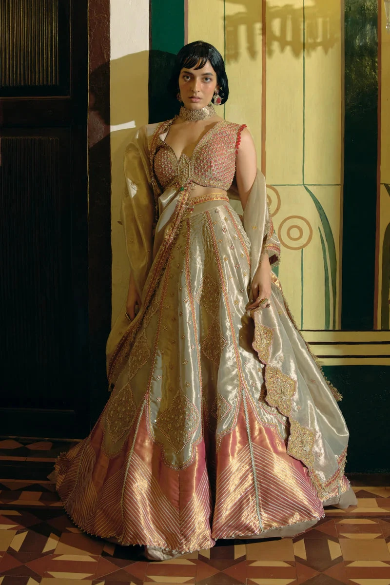 This Kalidar lehenga set in rose gold silk zari tissue and Jacquard silk Banarasi features Jharokha-inspired panels, floral boti embroidery, and intricate embellishments. The ensemble includes an embroidered blouse with cutwork and a rose gold tissue dupatta adorned with floral embroidery and pearl details with a signature embellished belt.