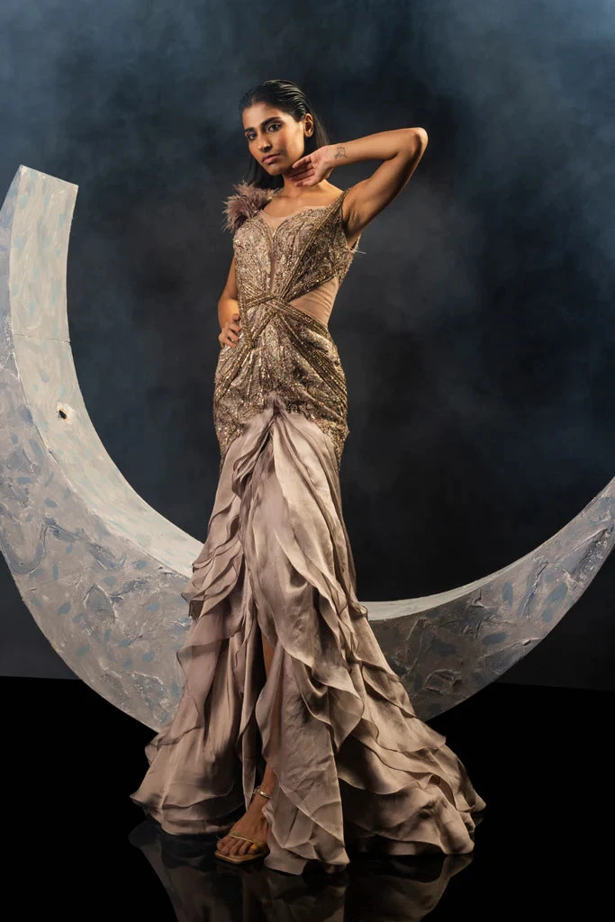 Rose gold gown with delicately layered skirt and metallic lush embroidery
