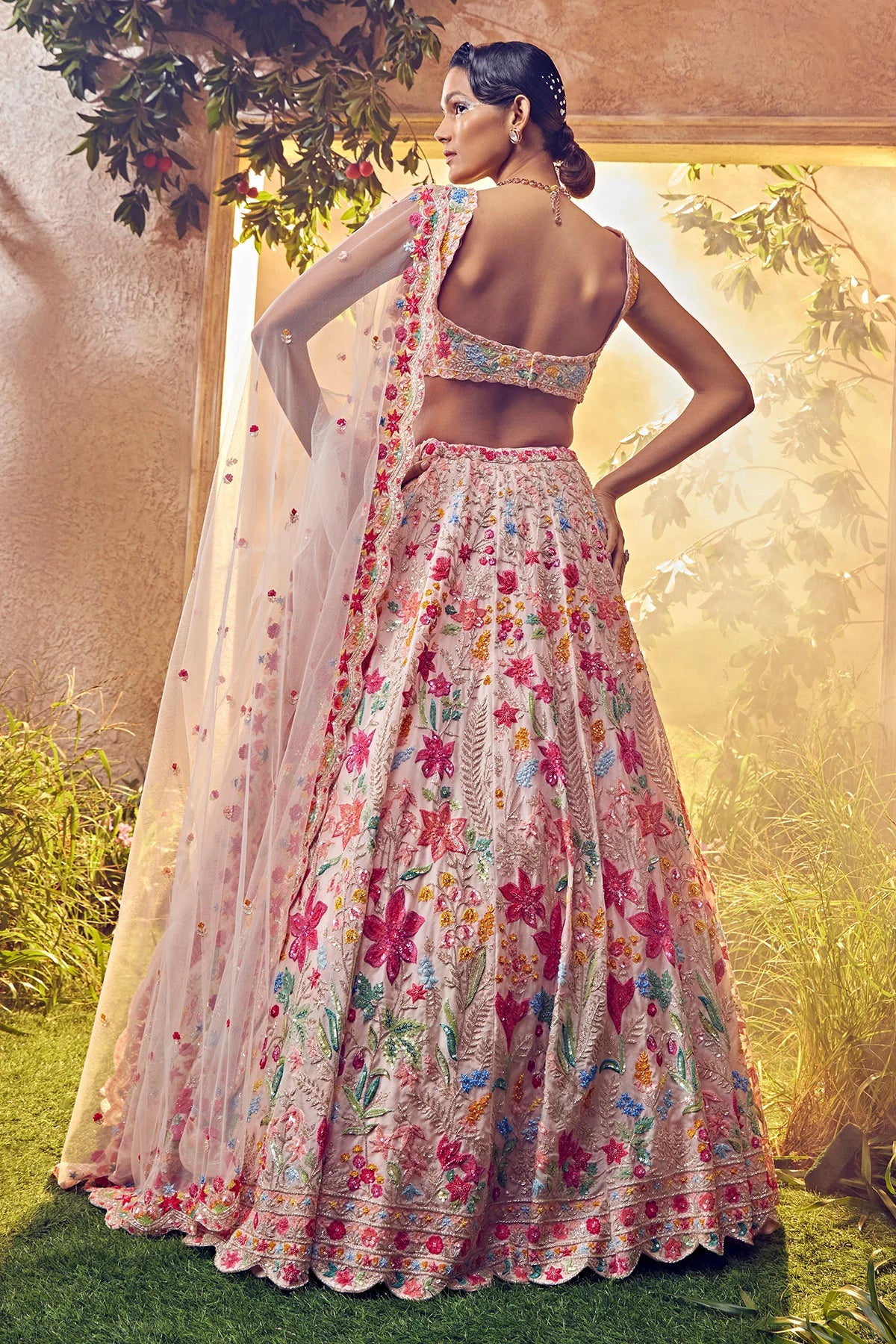 Featuring a rosewater pink organza lehenga embellished fully by hand with intricate foliage motifs featuring Threadwork, Sequence , Beads and colourful Japanese bugle beads. Paired with a matching blouse and dupatta