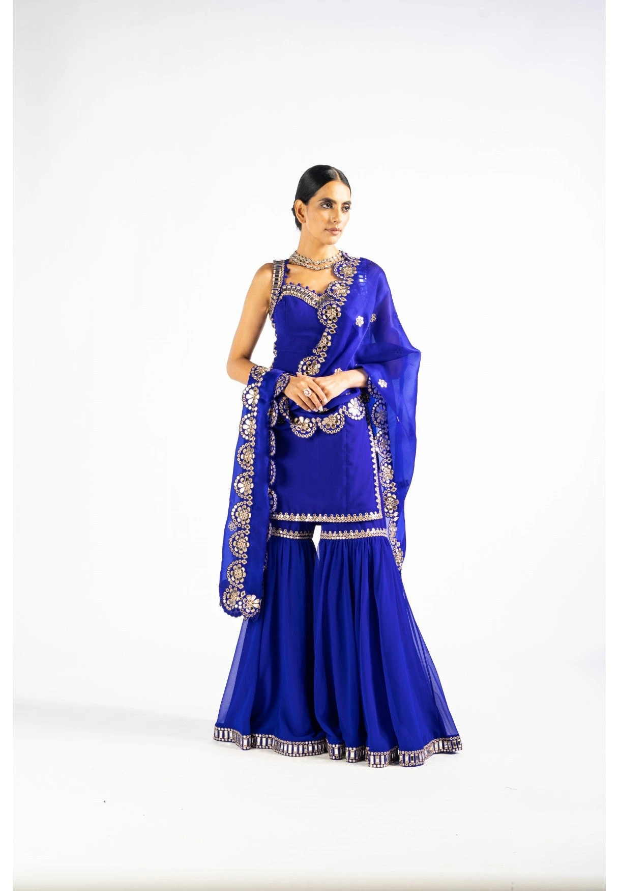 Royal blue georgette sharara with real hand-cut mirror embroidered satin organza dupatta.