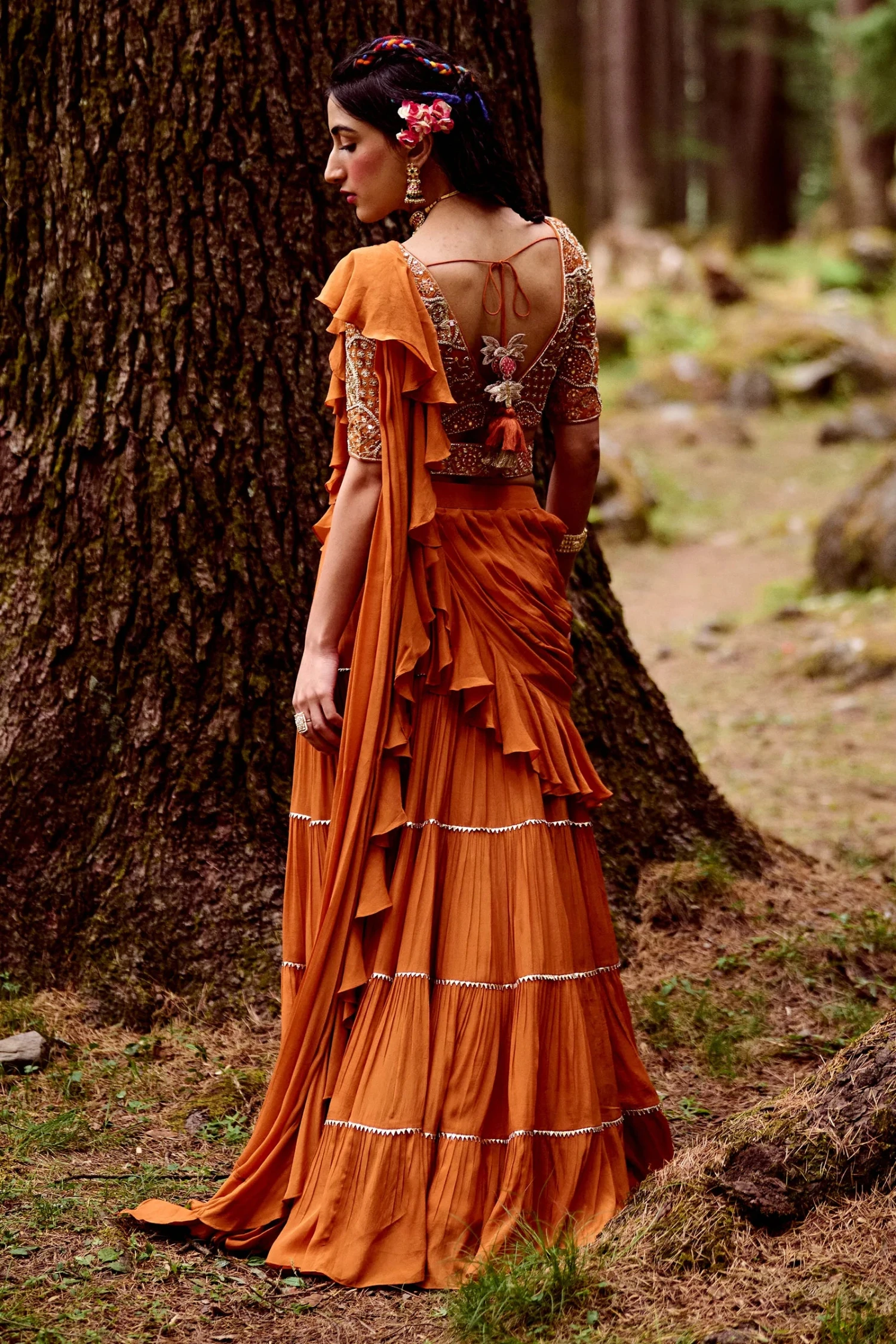 A rust orange four–layered pre-draped ruffle saree with dainty gota patti borders, paired with a naksha embroidered blouse embellished with dabka work, mirror, moti, cutdana and zari work paired and a geometric belt. It works well from day wear to an evening look.