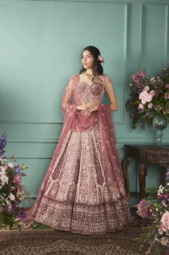 Featuring a rust rose lehenga set in velvet base with zardosi hand embroidery paired up with a corset style blouse with pearl detailing. It includes a net dupatta with tassels around the edges.