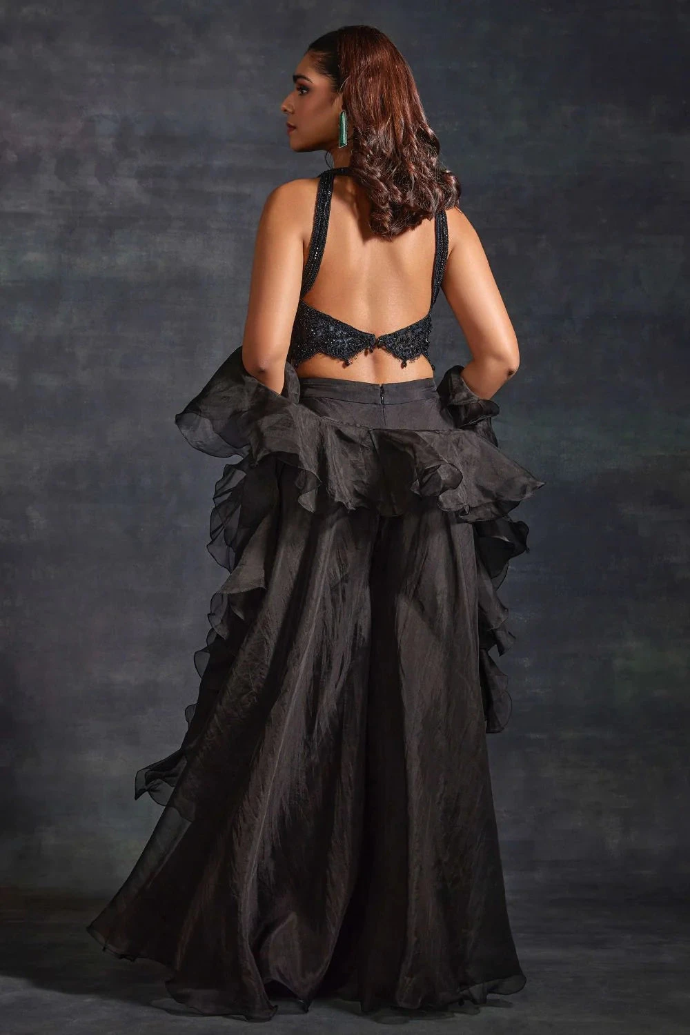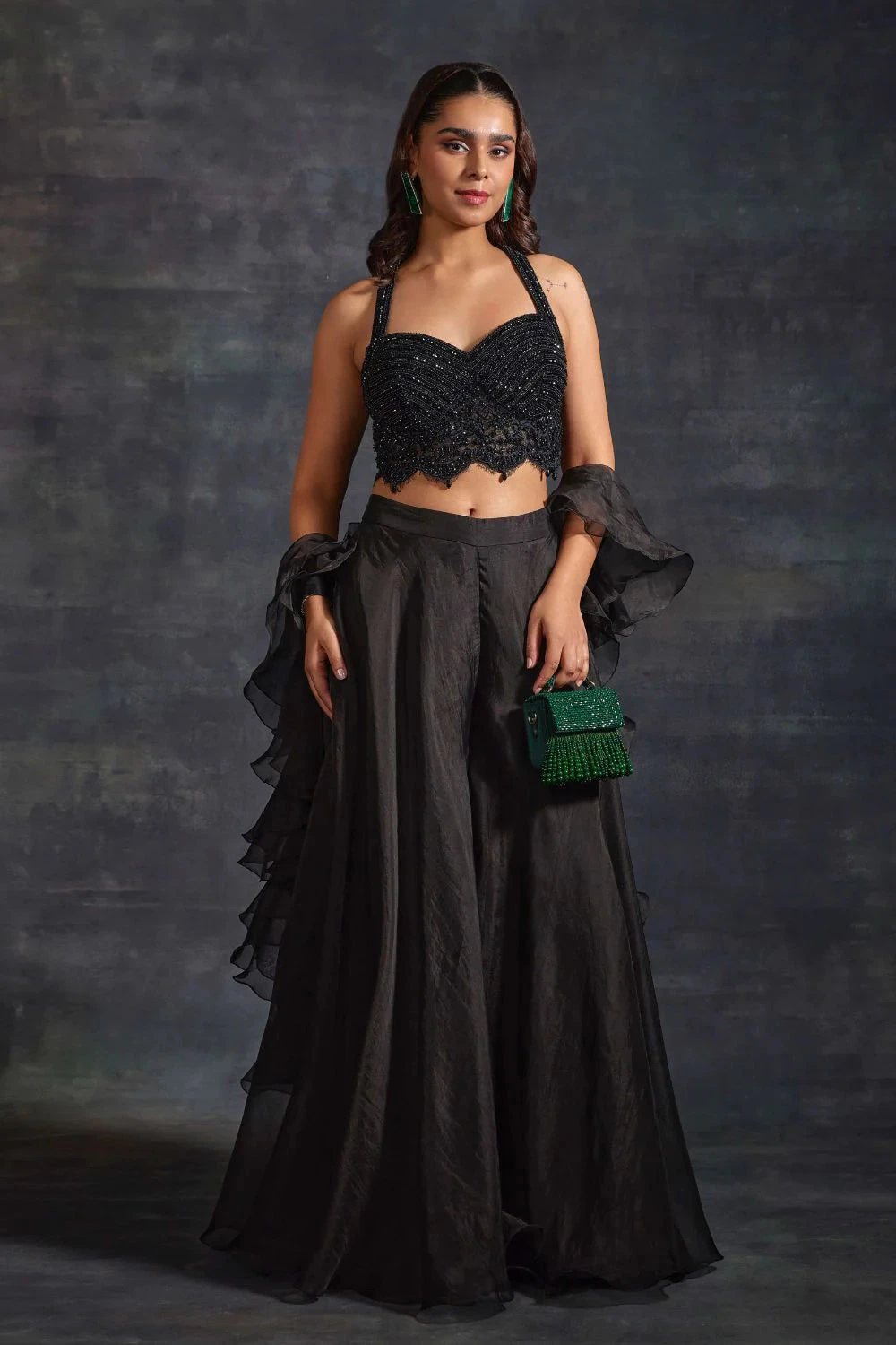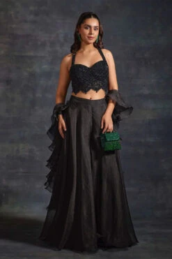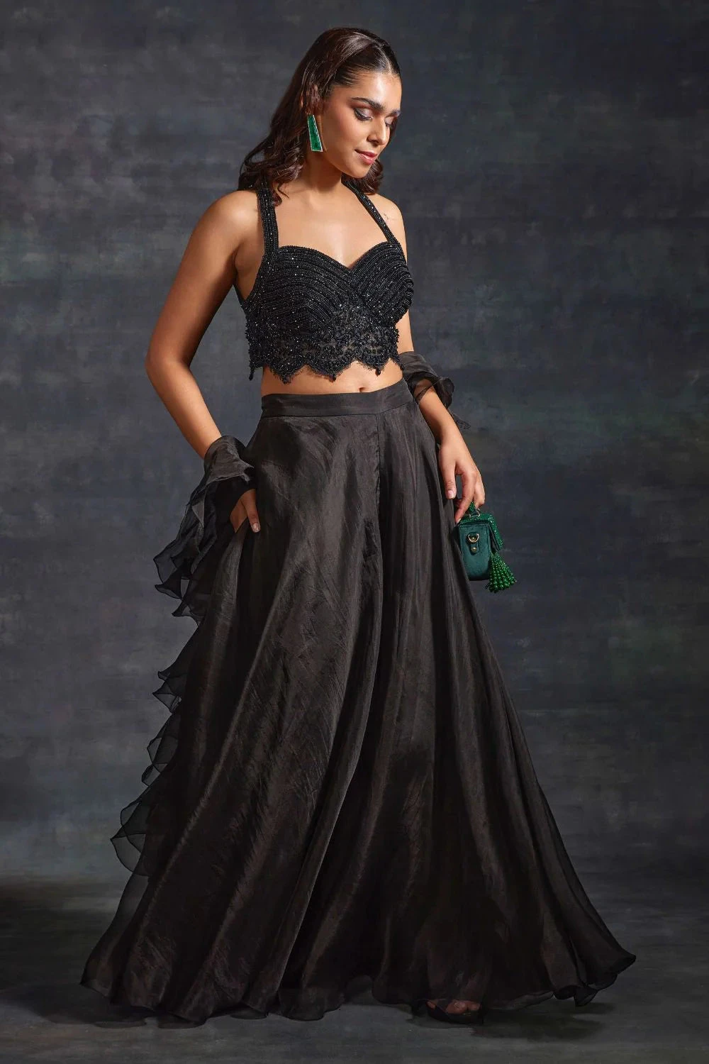 Blouse- Embroidered solid black blouse, Lehenga- organza divided lehenga and Dupatta- Organza ruffle dupatta.