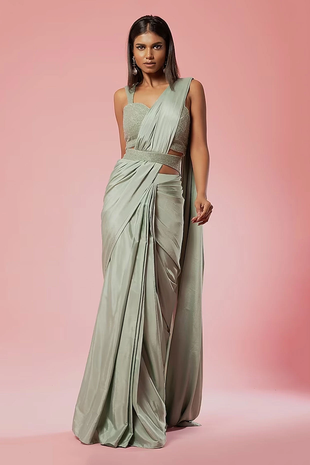 Featuring a sage green pre-stitched saree in crepe silk base. It is paired with a matching blouse having hand embroidery and a waist belt.