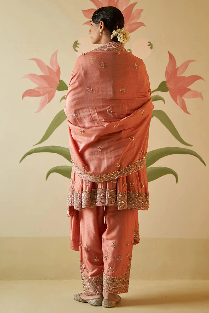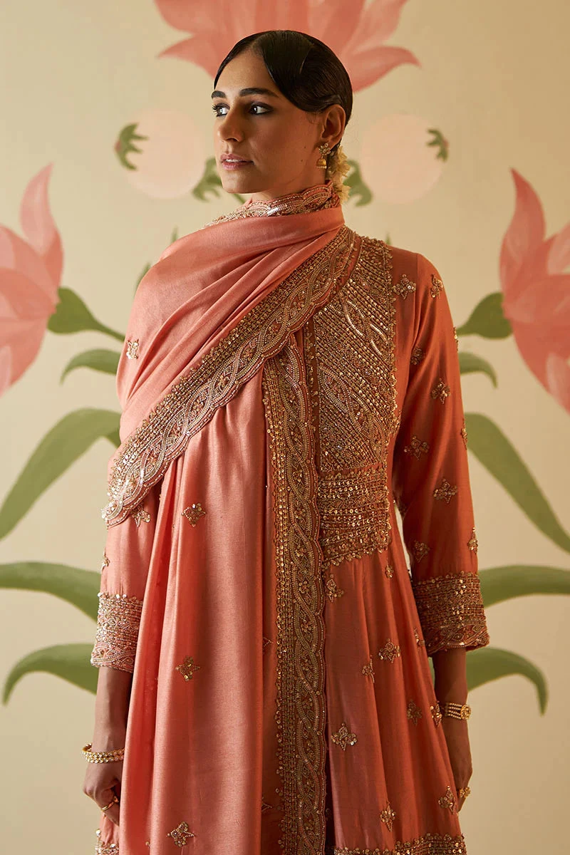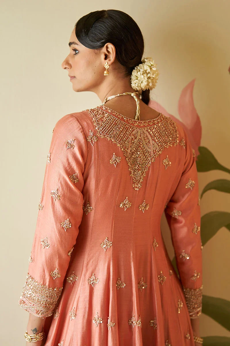 Featured here is salmon pink anarkali set embroidered with sequins, pearls and crystals.