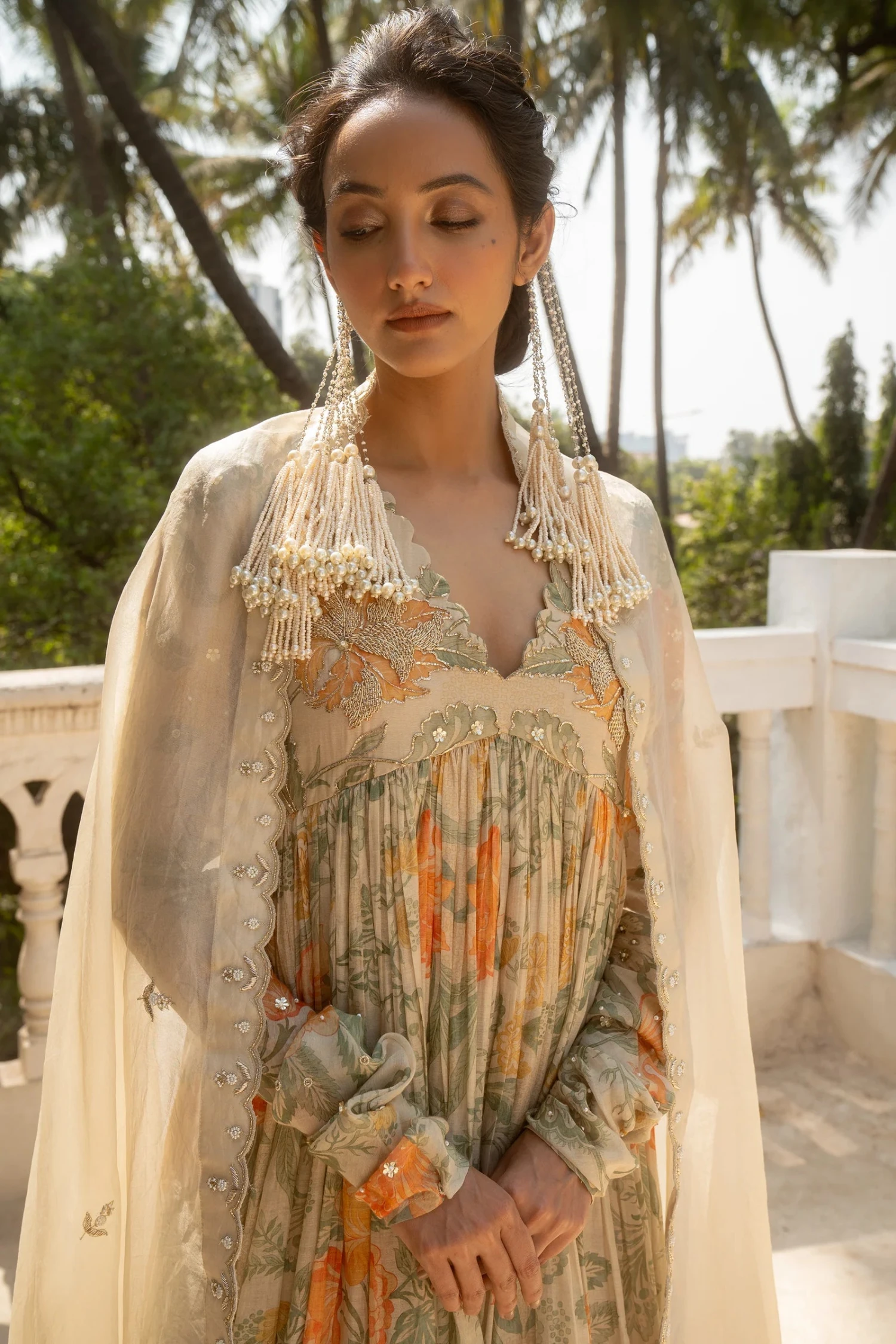 A scallop neck detailed anarkali in our signature floral print with hand-embroidery detailing. It is paired with an embroidered dupatta and pants.
