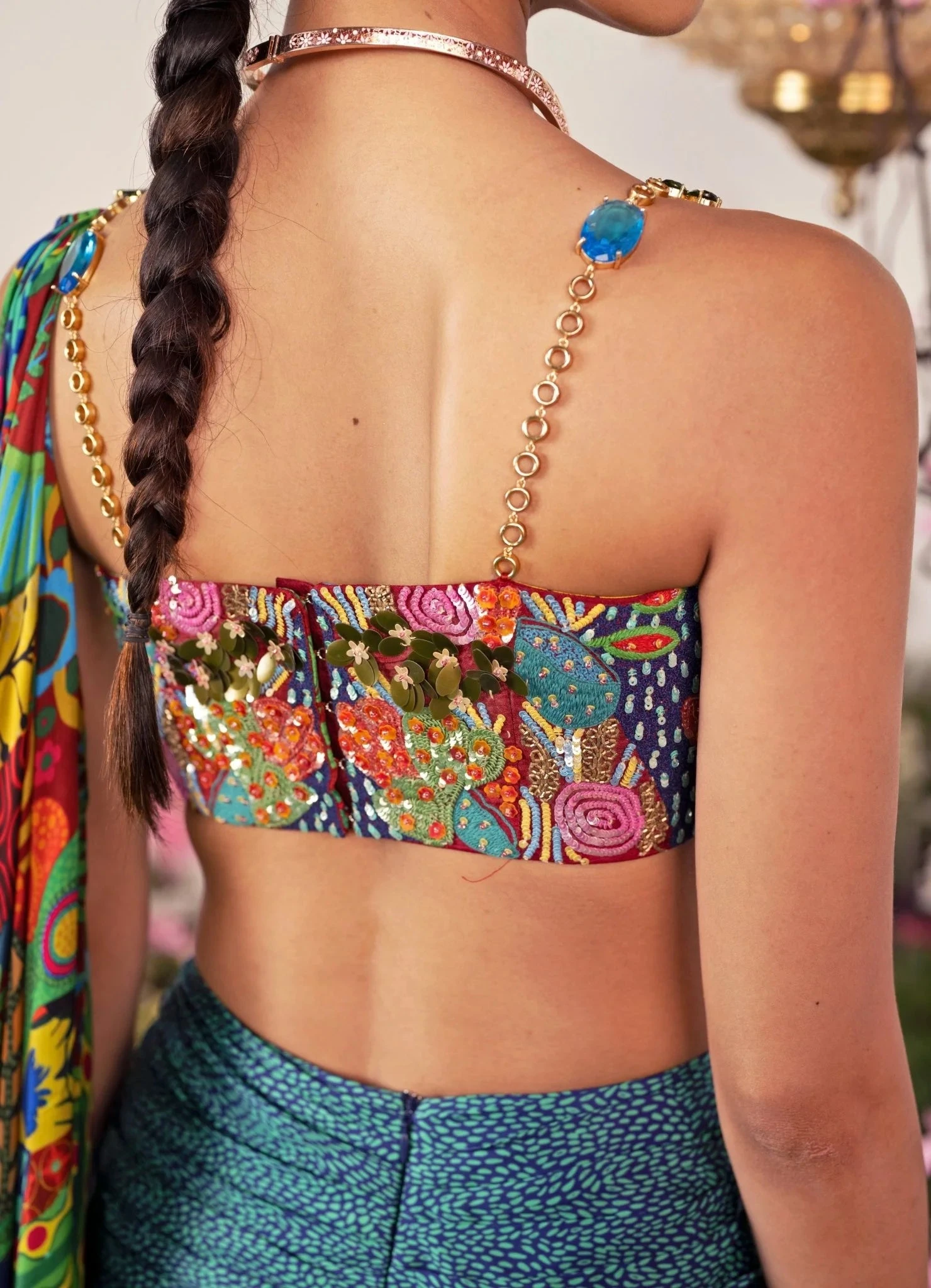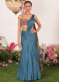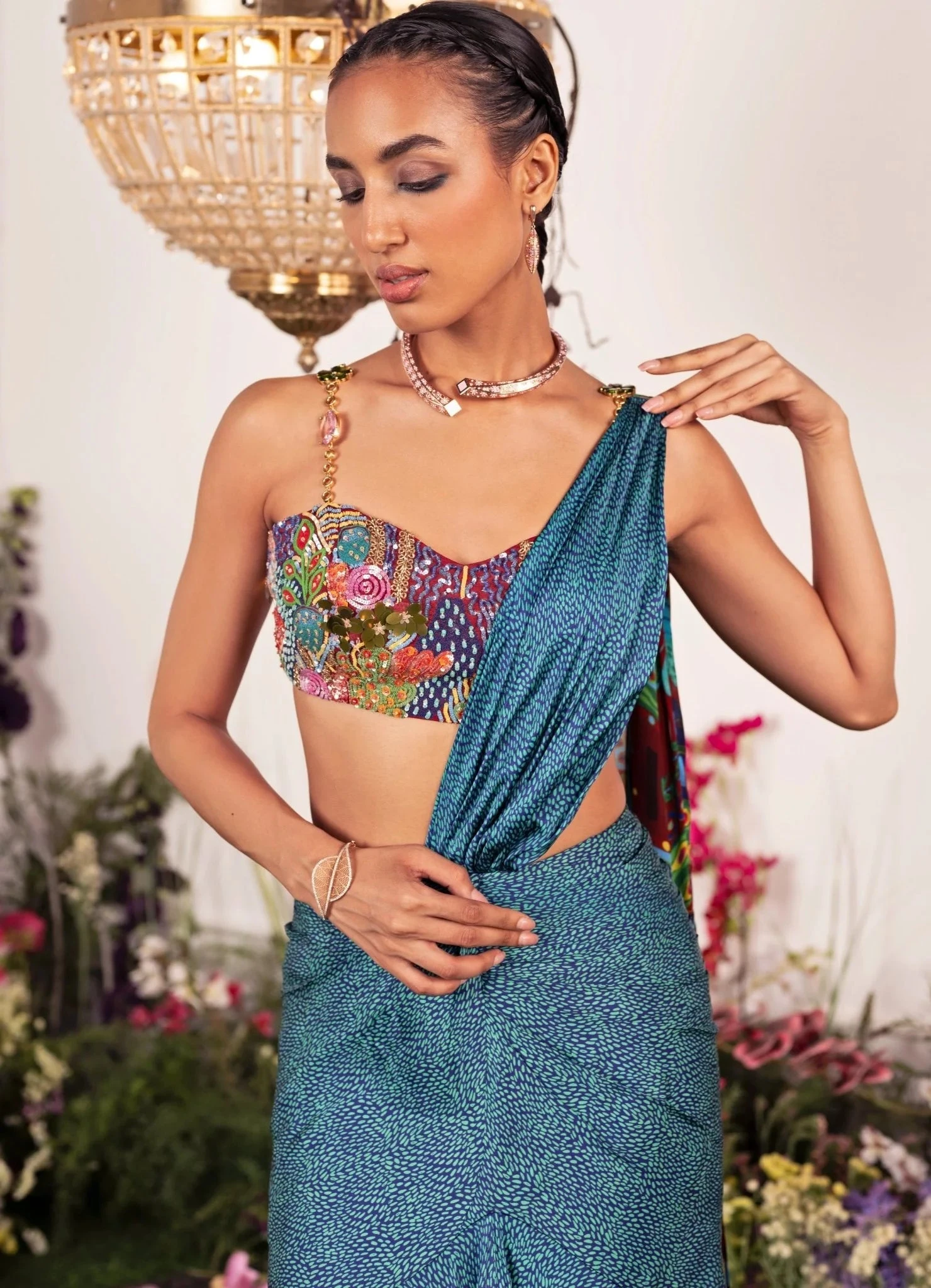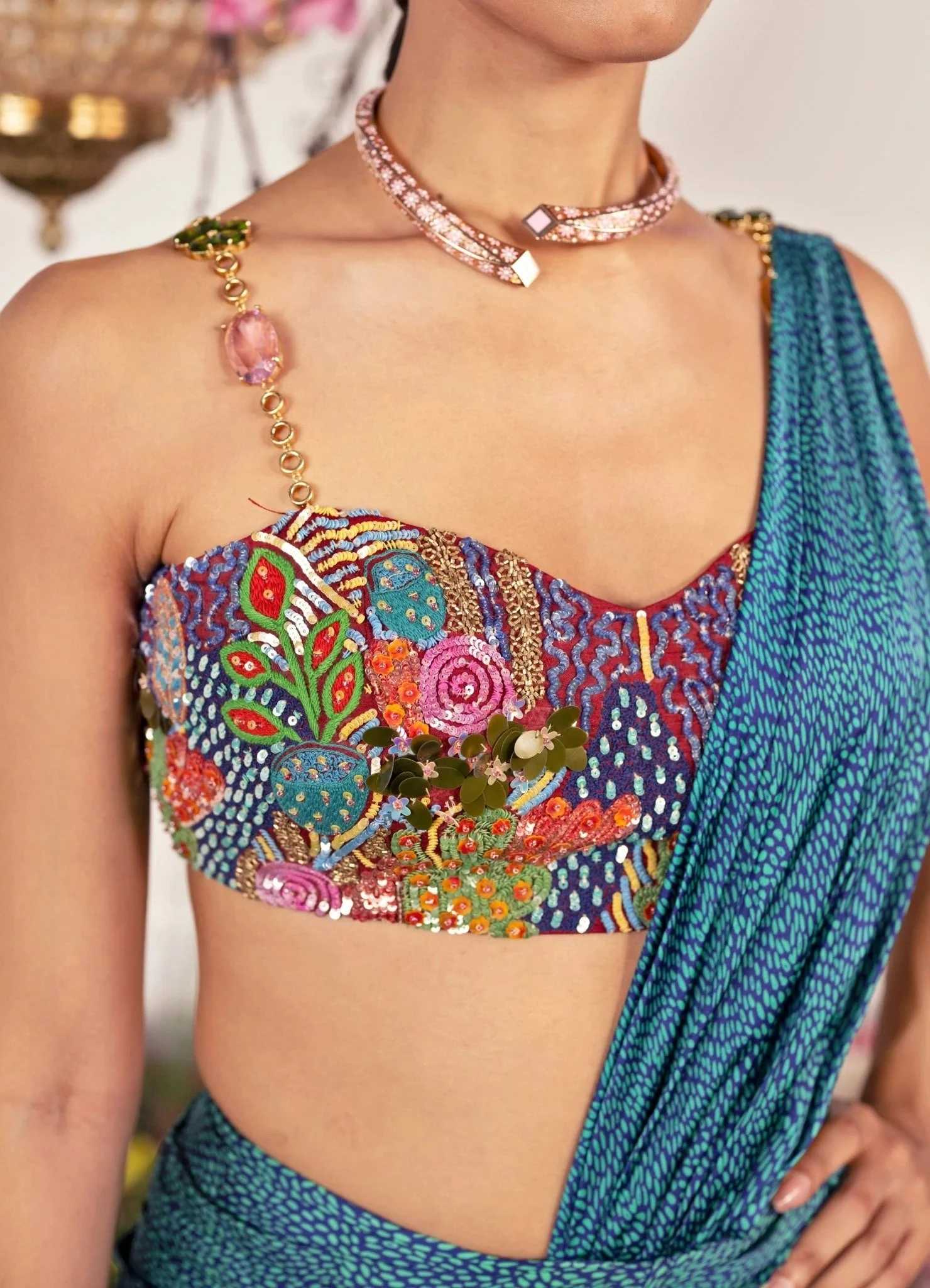 Introducing our exquisite Sea Blue Printed Silk Satin Saree, a perfect ensemble for receptions and sangeet ceremonies, especially ideal for destination weddings. This stunning outfit features a beautifully draped concept saree paired with a vibrant, intricately embroidered blouse, ensuring you stand out at any celebration. The blouse features intricate hand-embroidered motifs, showcasing a blend of traditional and contemporary designs. The gold chain straps with gemstone embellishments add a luxurious touch.