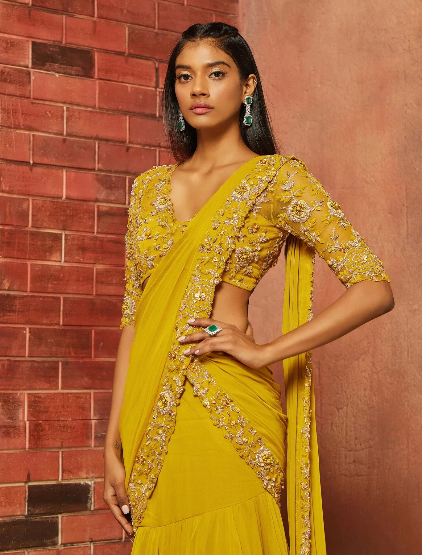 Yellow & champagne gold embellished net blouse featuring a concept back & elbow length sleeves, paired with a georgette based ruffle sari & an embellished pallu.