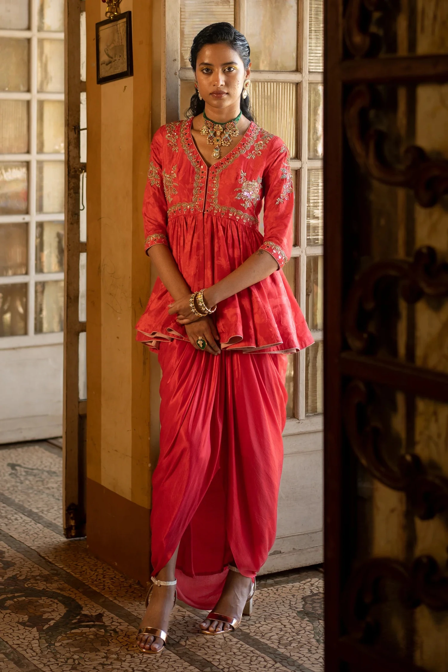 Featuring a self–woven russian jacquard peplum set paired with satin draped skirt and peplum is embellished using antique tone hand work.
