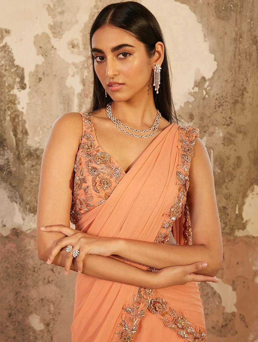Peach layered georgette sari with a pre-stitched and pre-draped pallu with gold and rose gold 3D hand embroidery & a matching hand embellished blouse with a tie back.