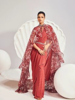 Basking in the distinctive silhouettes for a palatial finesse, SERENA Saree Set is a composition of a pre-drape saree with embellishment highlights, overlapped solid blouse with tie-up, and printed ruffle cape with embellished collar and tassels tie-up.