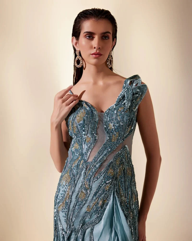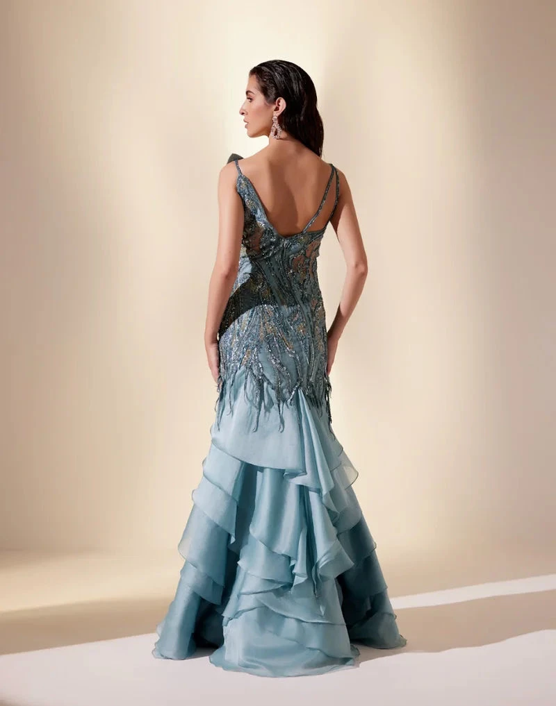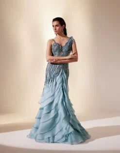 Stellar gown with delicately layered skirt embellished with delicate sequins that twinkle like distant stars.