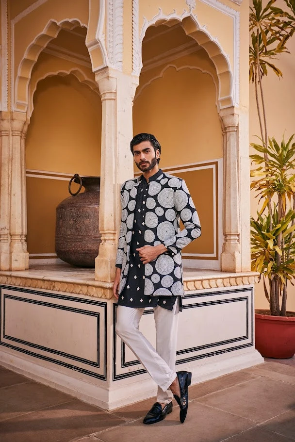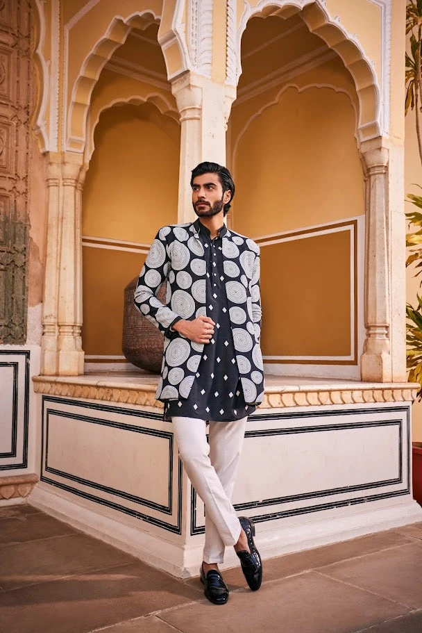 The Royal Atelier designs this alluring front-open jacket in silk enriched with abstract prints, teaming it with a kurta and contrasting pants. Style the look with leather slip-ons for a festive vibe.