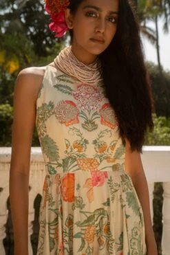 Sherbet Orange Jungle Print Pre Draped Three Layered Saree Set