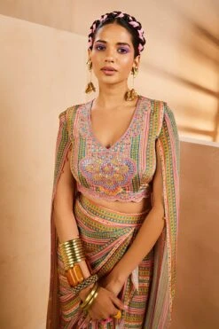 Sunshine Yellow Crystal And Sequin Blouse Paired With Flared Pants And Net Cape