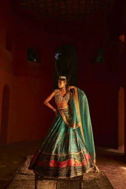 Teal Sharara And Crop Top Set With Colorful Resham, Cut Dana And Moti Embroidered Spring Blooms