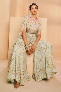 Turtledove White Sharara Suit In Sequins Embroidery, Paired With A Long Embroidery Cape