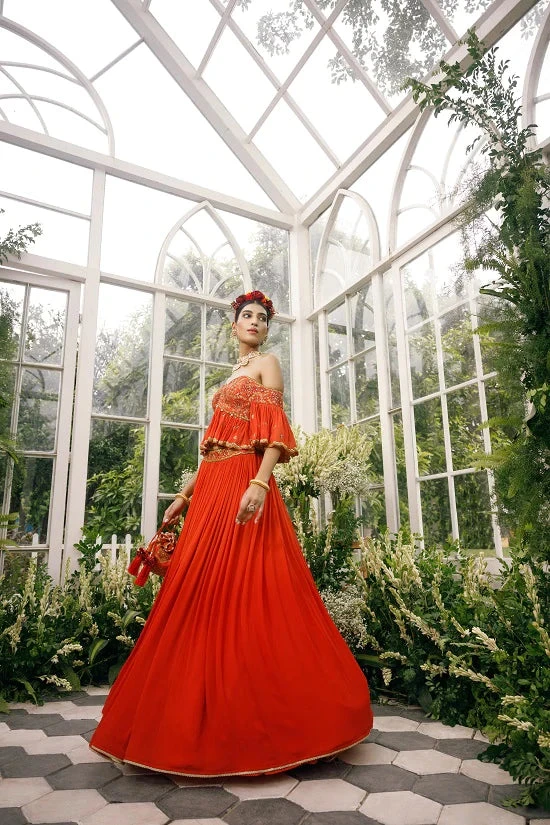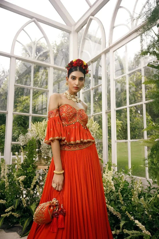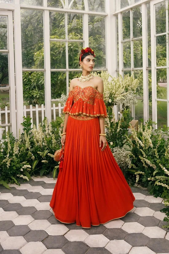 Silk off shoulder blouse with frills embroidered with multi colour thread embroidery with antique sequin and zari work combined with dori embroidery.the blouse is padded with back opening.the blouse has scallop deisgn on the neck and underbust with pearl hanging on the waist line.the frill on the blouse is also embroidered with scallop border .the skirt is made with georgette shaded ombre dye with embroidered belt.the bottom of the skirt has lace finishing.