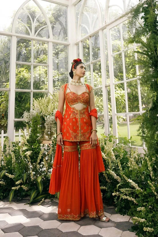 - Fabric : Silk bustier,silk jacket with sequin embroidered georgette dupatta and sharara