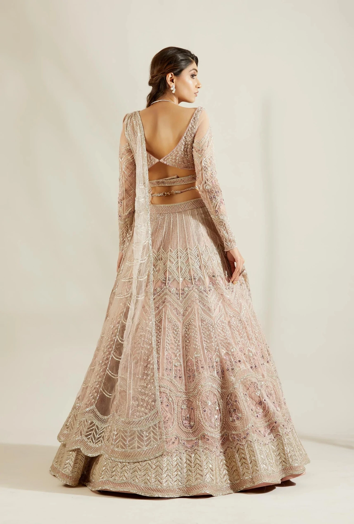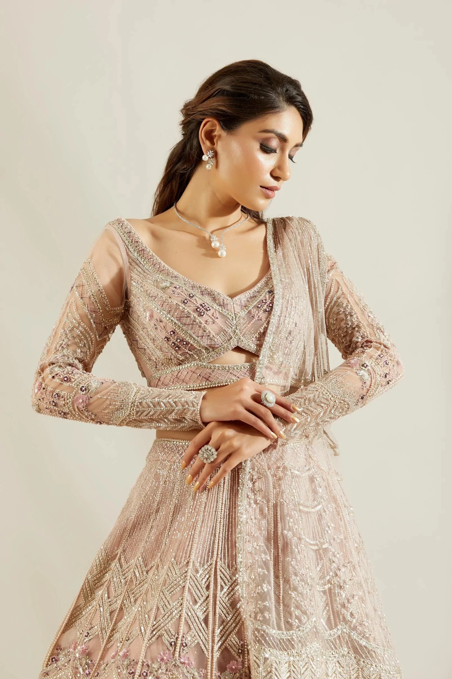 Silver, pink lehenga with stripes, geometric & floral embellished motifs. Paired with an embellished & cutout bustier, embellished scallop dupatta & embellished belt.