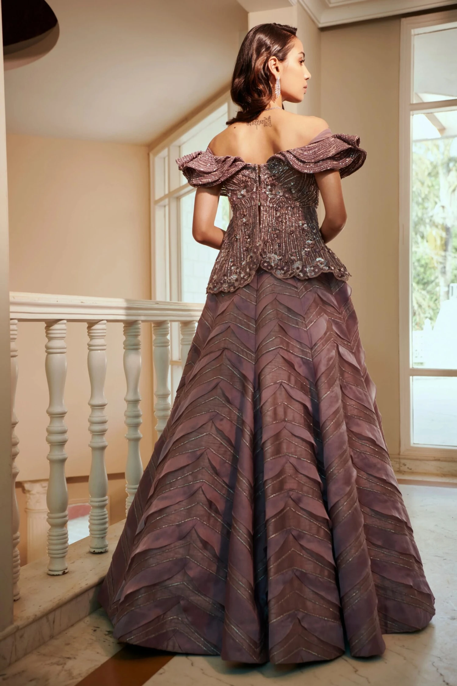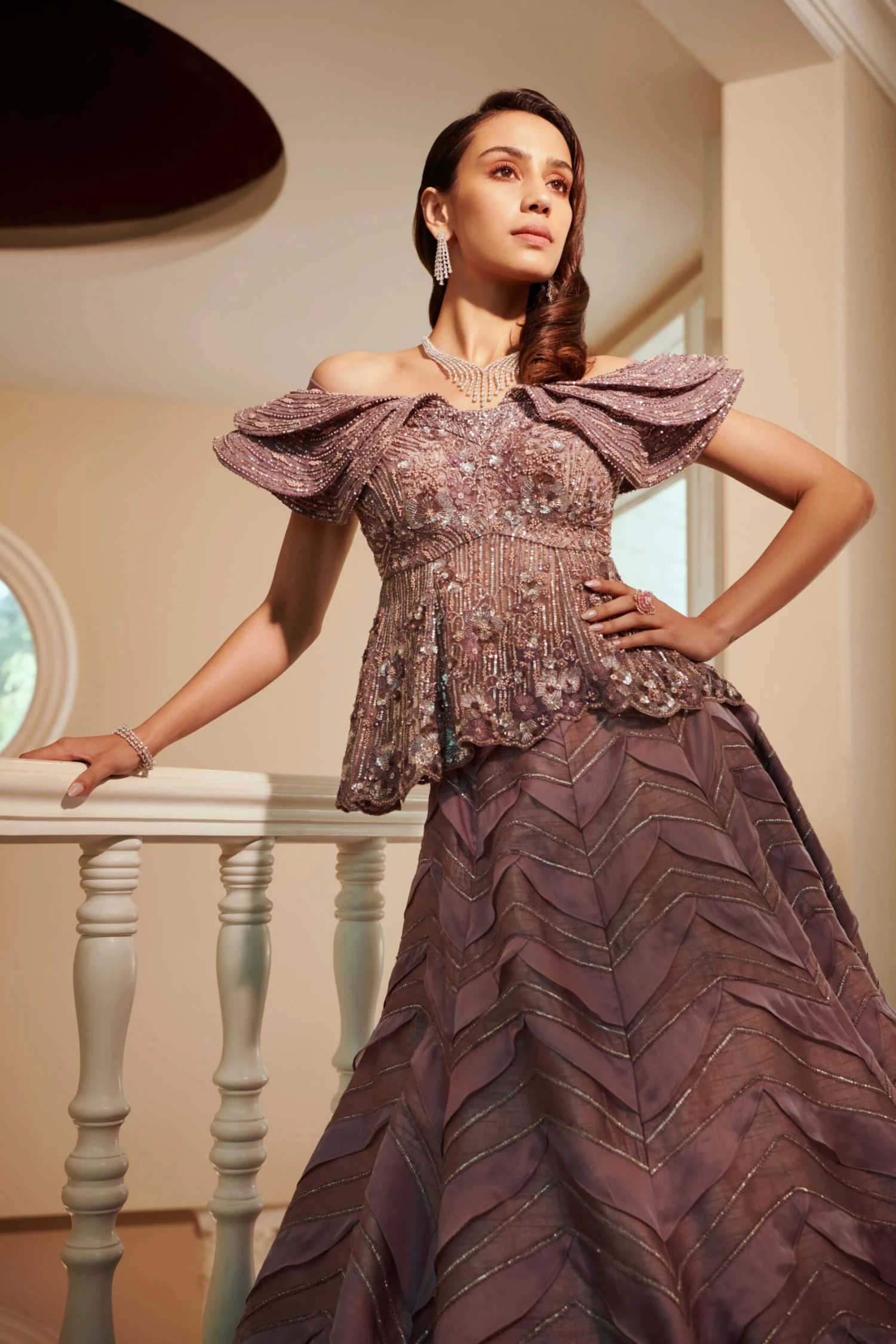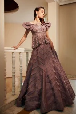 This comes with an embroidered Peplum bodice and skirt having organza ruffles placed rhythmically. It has structured shoulder details which is emphasizing the overall silhouette.