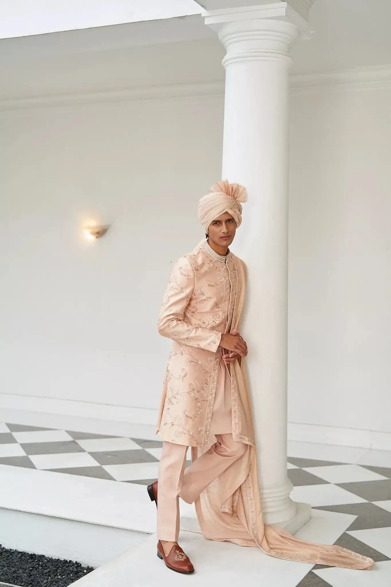 Soft hues of pink and tonal resham paired with delicate pearls makes this sherwani a love at first sight