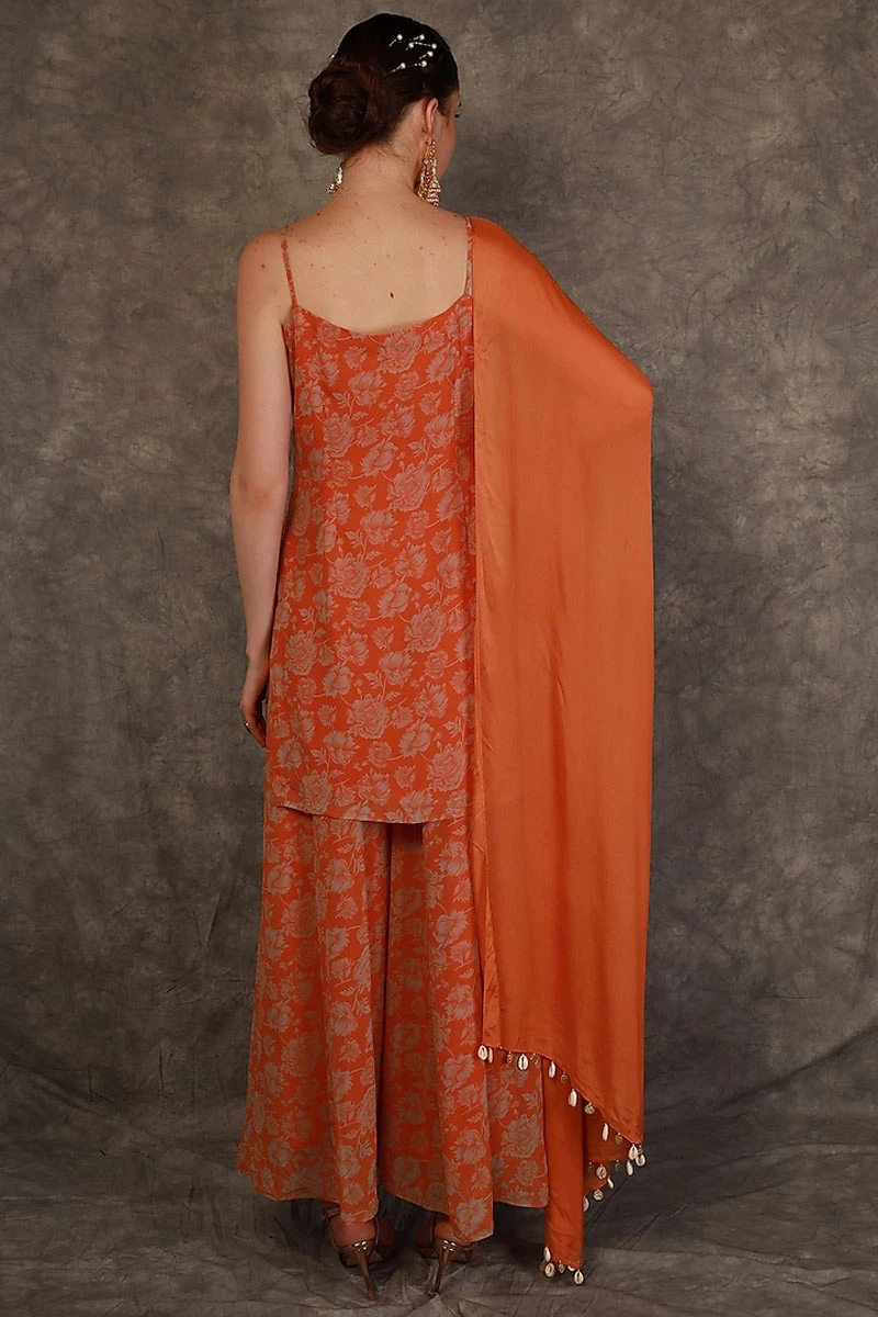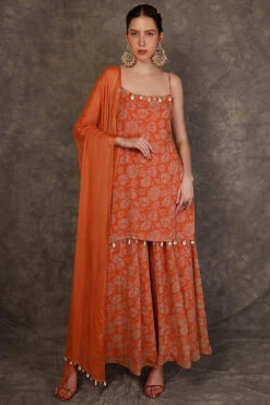 Featuring a tangerine kurta in georgette and chinon base with print, sequins and shell embellishments. It is paired with matching sharara pants and a dupatta.