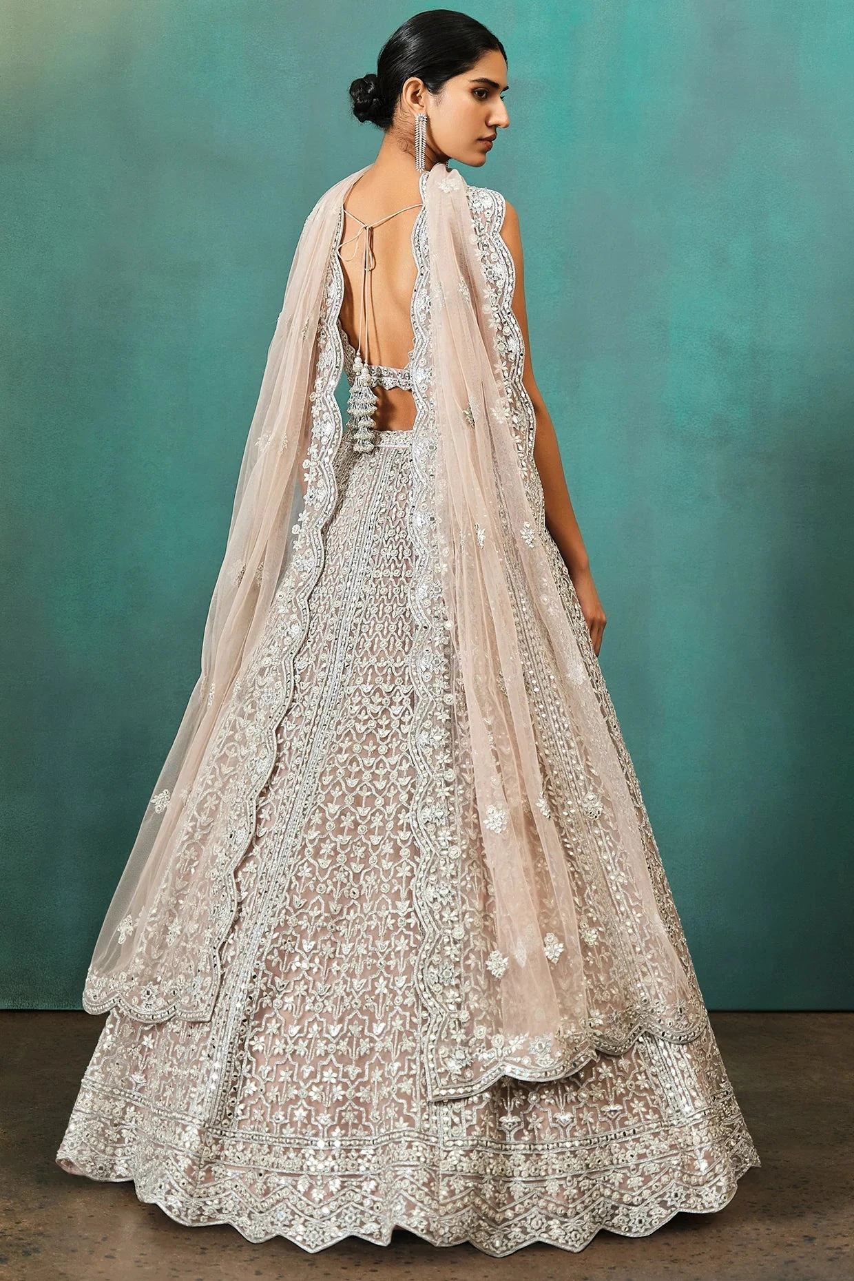 Featuring A Taupe Net Lehenga With Checks And Floral Pattern All Over With Broad Scallop Border In Zari, Mirror And Thread. It Has A Matching Blouse And Dupatta To Complement The Look.