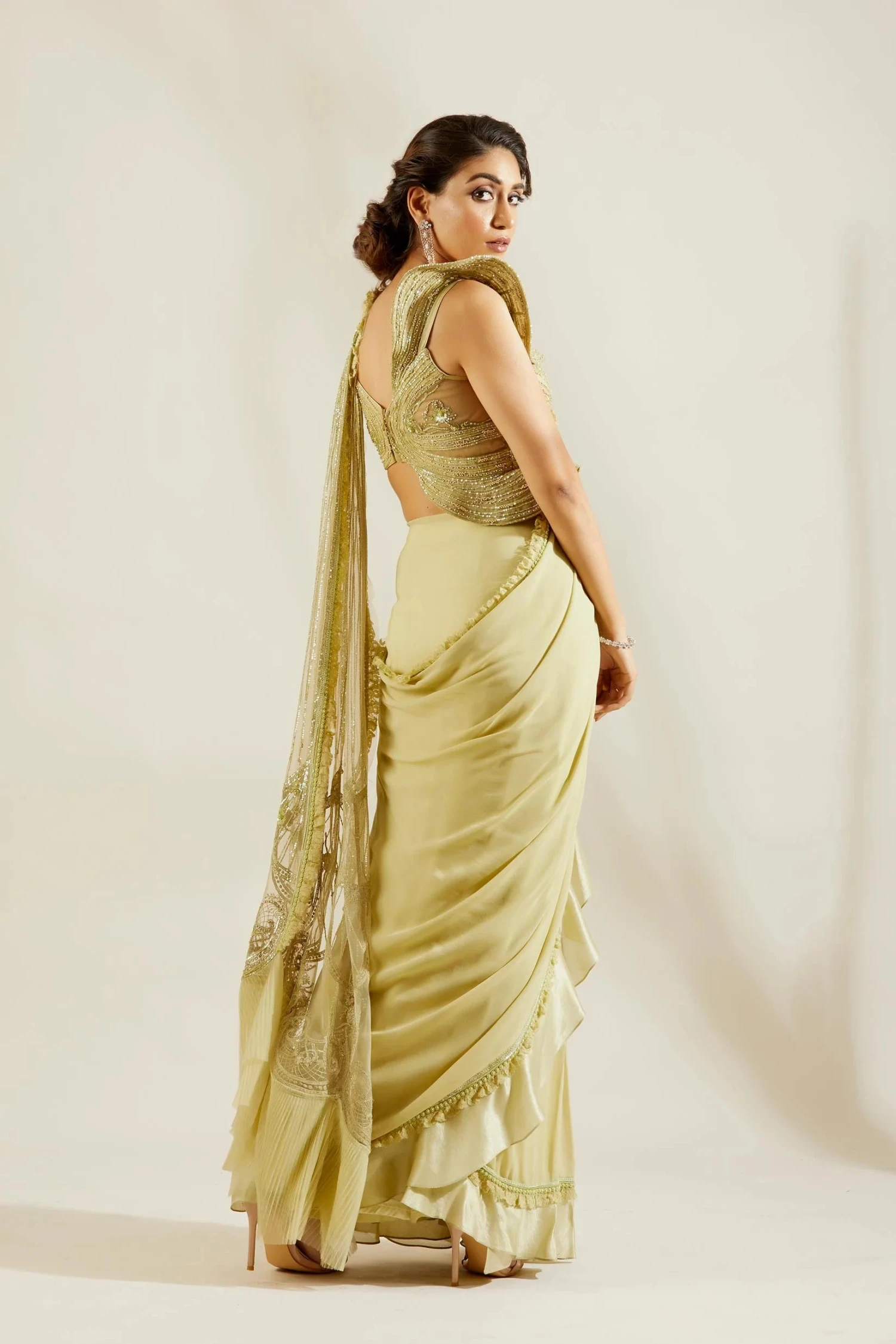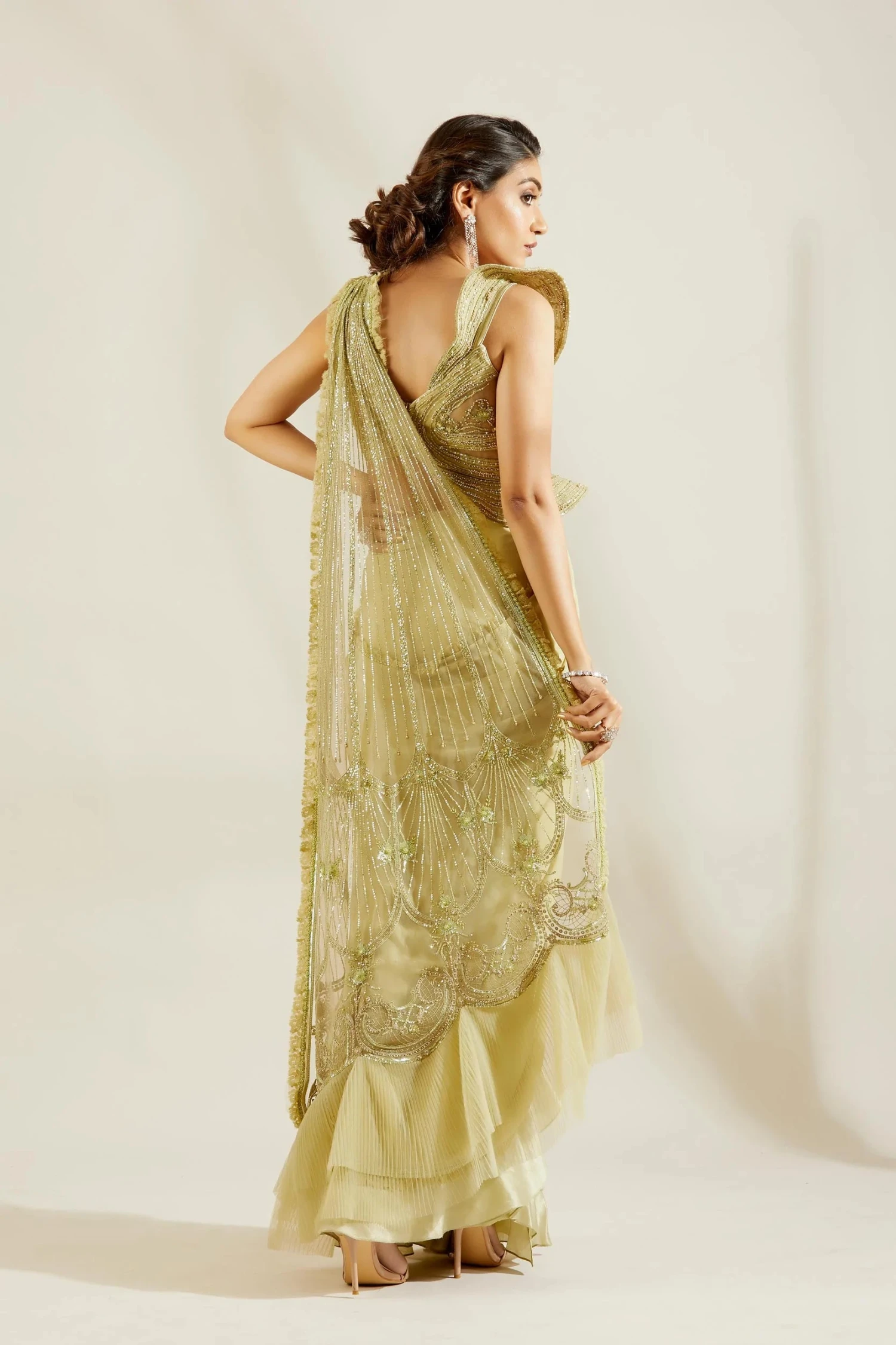 Tea green pre-stitched saree with ruffle border & net embellished pallu. Paired with a ruffle sleeve, sculpted peplum embellished blouse.
