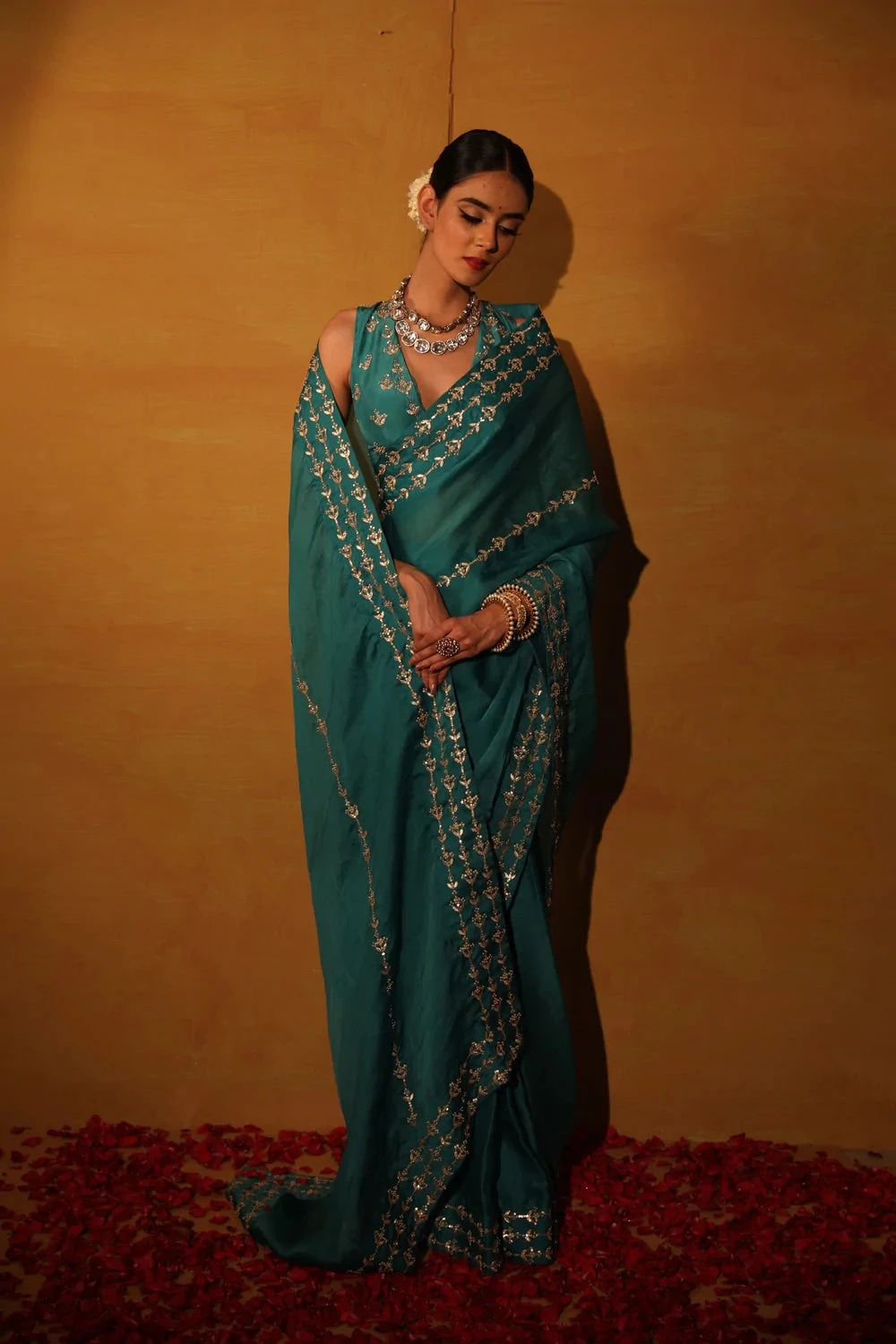 Teal green saree in organza base embellished with champagne gota, moti & sequins work. Comes with a teal green plunge V-neckline embroidered blouse and petticoat.