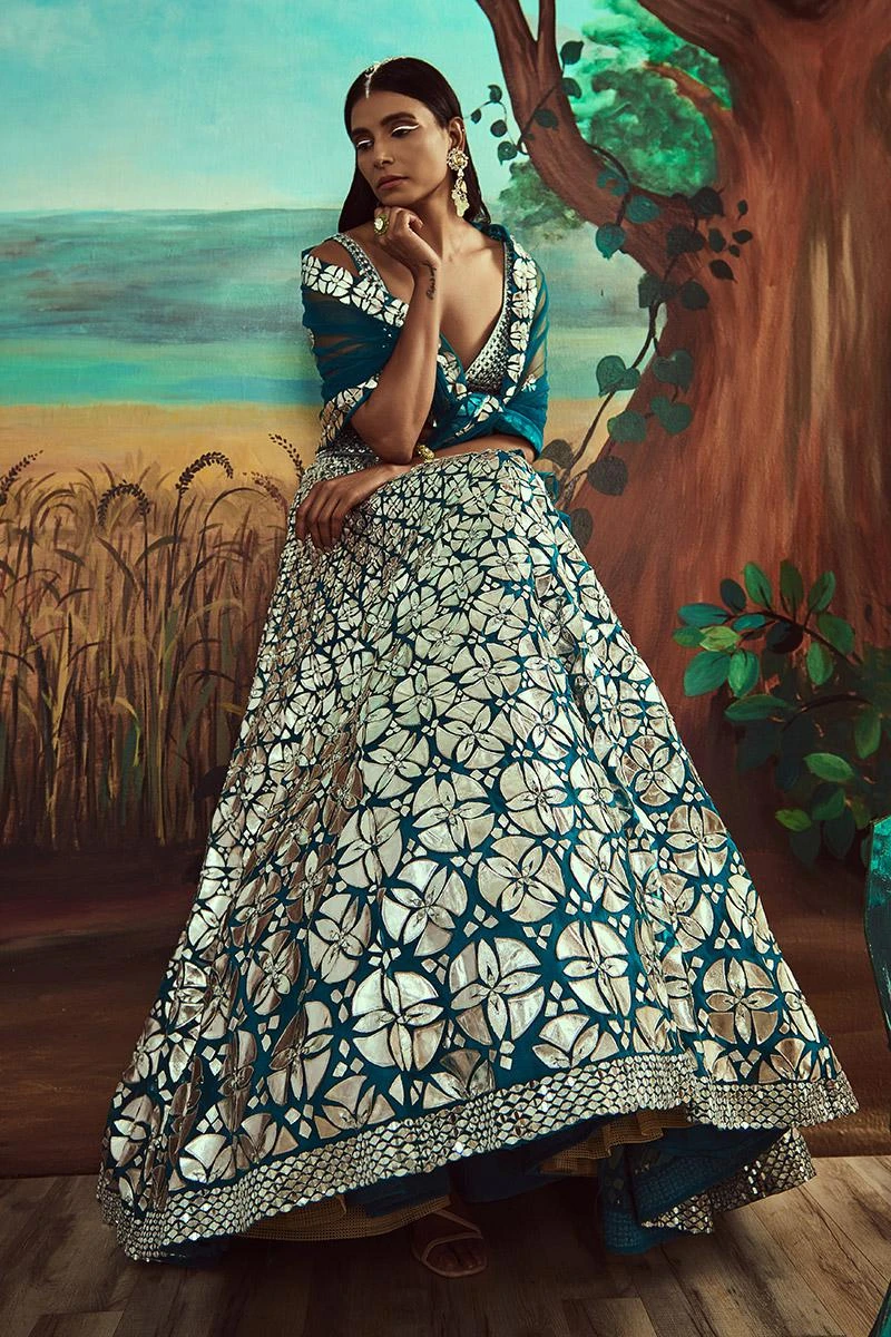 Teal organza lehenga set embroidered with textured leather and mirror encrusted by silver zari.