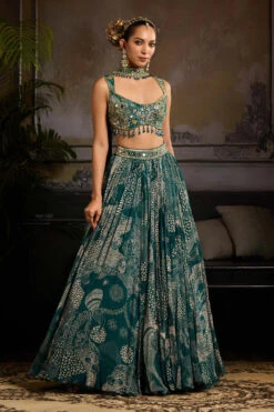 Teal Abstract Jaal Print and Highlighted Blouse and Teal Abstract Jaal Print and Highlighted Lehenga with Choker Dupatta