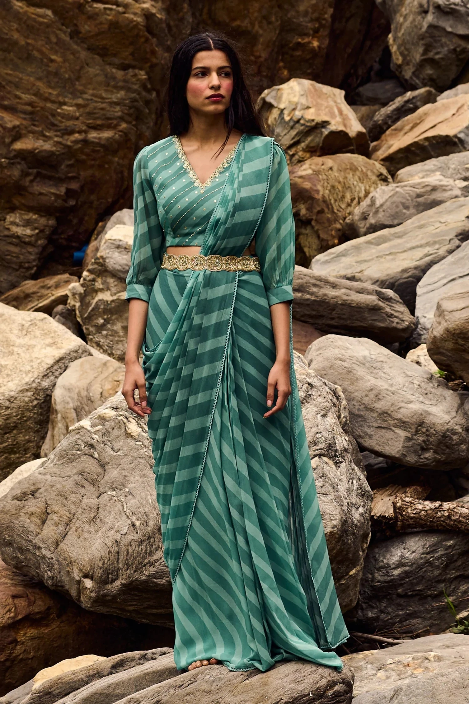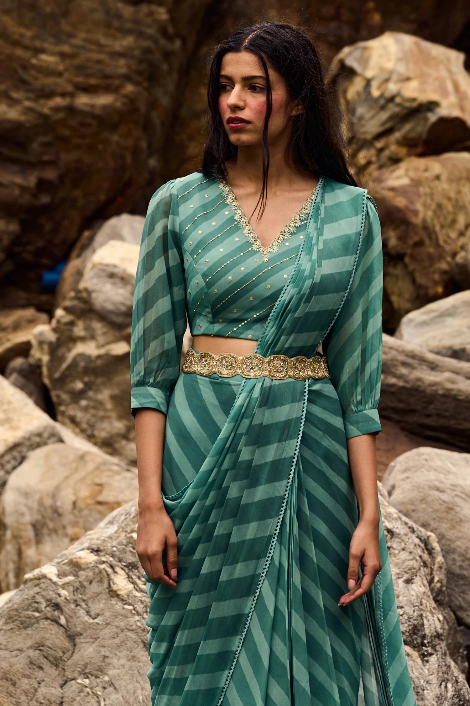 Teapot blue leheriya pre–draped saree, paired with a square cutdana belt and hand–embroidered blouse embellished with moti, dabka work, sequins and cutdana.
