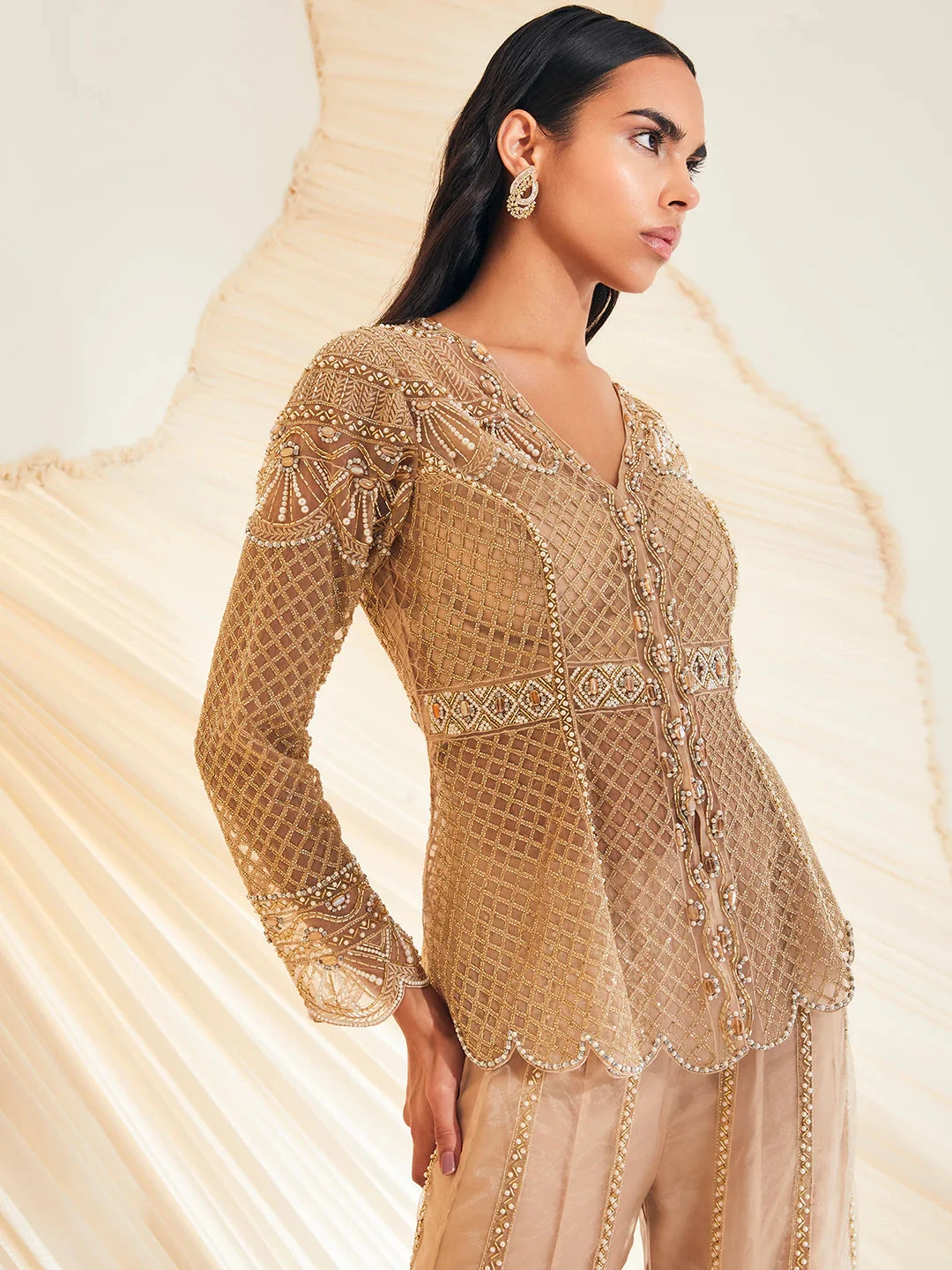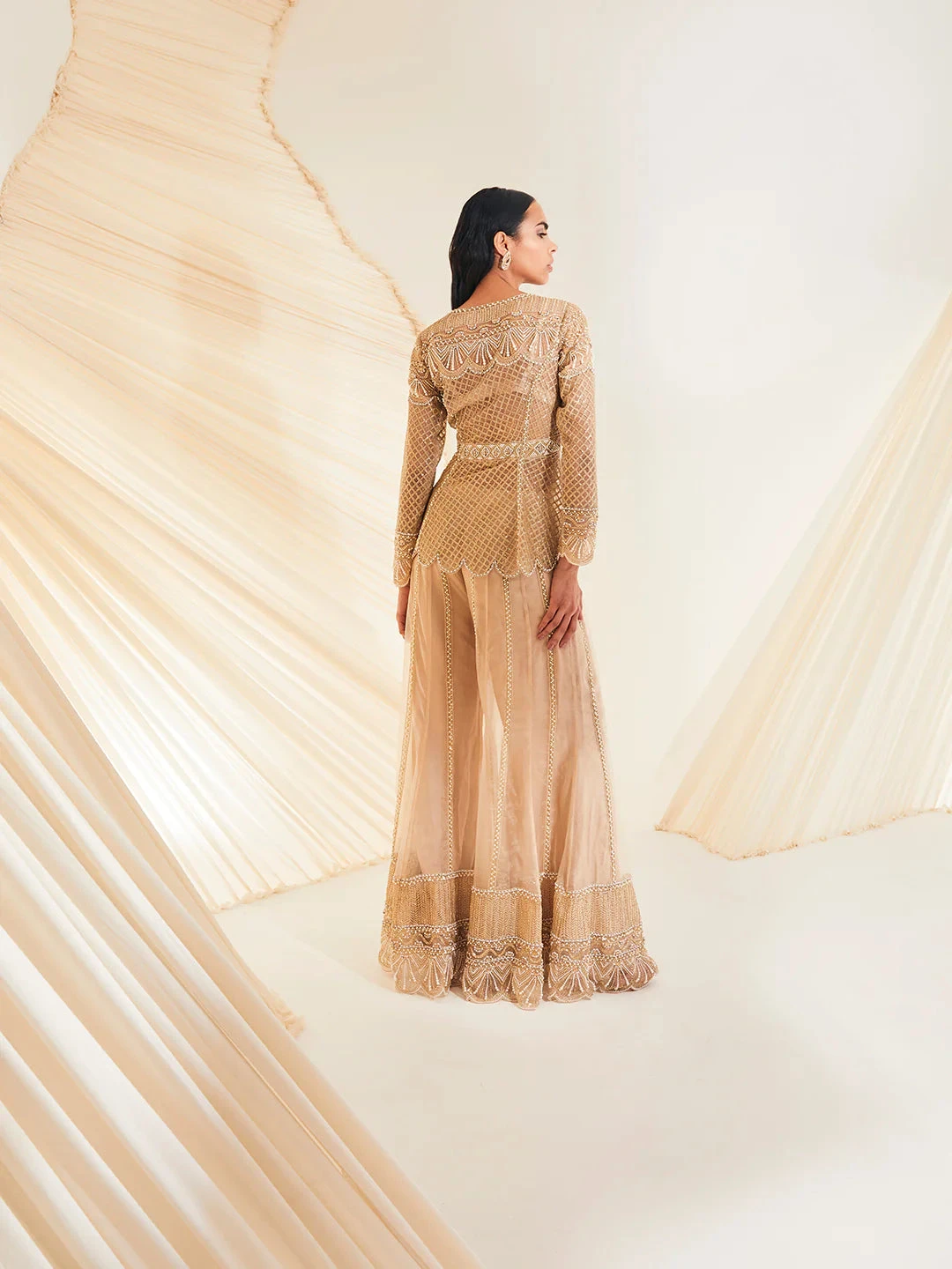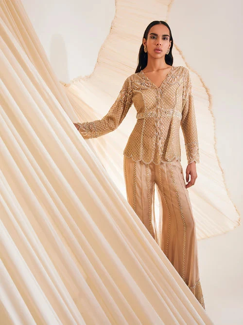 Our Teigen sharara set is perfectly accentuated by trellis-like detailings and pearl elegance. The neat tailoring and scallop hem are the sartorial choice for your upcoming occasional and special parties.
