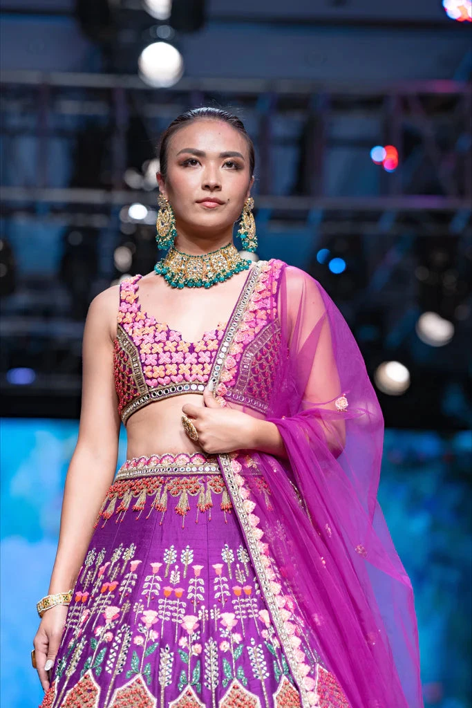 Lehenga : Rawsilk , Blouse : Rawsilk , Dupatta : Net , Emboidery : Metal Embellishments, Mirrorwork , Threadwork, Sequin Work, Cutdana Work, 3d Flower Work